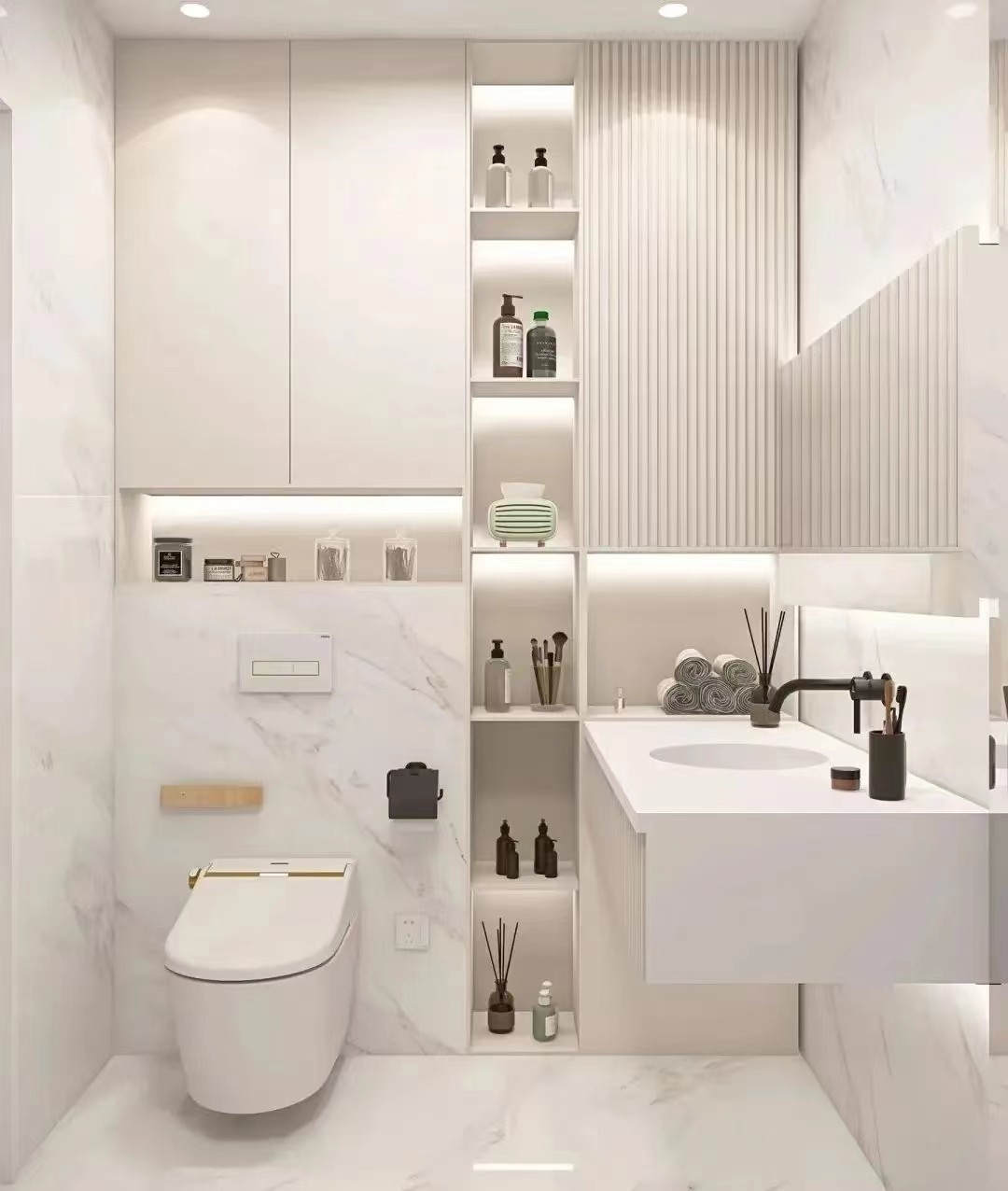 我们可以借助上图的工具——移位器 来调整位置马桶位置,但如果超过1米的距离,就不建议使用移位器,因为会影响马桶冲排的效果,导致堵塞。坑距过大的,可以考虑安装壁挂式马桶,不仅颜值高、还无卫生死角。或者打造一个收纳柜,还可以增大收纳空间。
