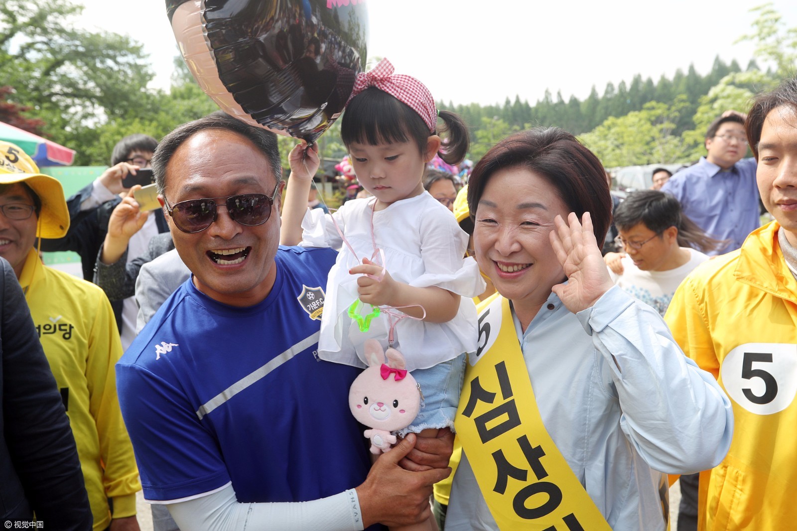 韩国正义党候选人沈相奵,搞怪扮丑与萌娃拍照(图片来源:视觉中国)