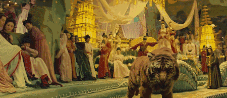 在电影《妖猫传》中,还有一场“极乐之会”的重头戏,是“戏法高手”们联袂打造的一场魔幻盛宴。这其中,固然有导演为了打造视听盛宴而使用的特技渲染,但其中也有许多“古彩戏法”的影子。比如,影片中道长黄鹤一下子变出了一只斑睛大虎,又将斑睛大虎变成一大堆五颜六色的鲜花。这个在“古彩戏法”中,是“手法门”与“彩法门”的结合。再比如,黄鹤的两个弟子白龙和丹龙伸开双臂变成仙鹤腾空而飞,这其实属于“古彩戏法”中的“搬运门”,只不过已经失传。