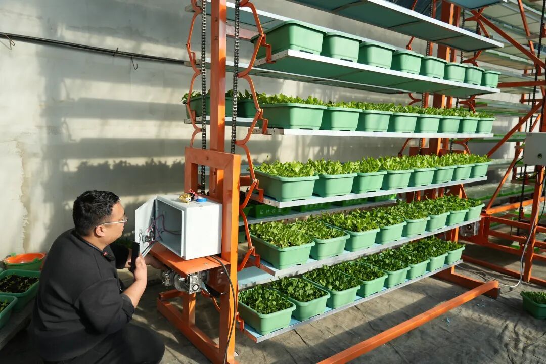 科技创新让“可食可赏”的果蔬更具底气。大棚内的立体旋转种植架,通过动态旋转让每株作物均匀采光吸肥,养得株型饱满、叶色鲜亮;种子编织机精准播种,让盆栽长势整齐划一,观赏度拉满;智能温控调温、微喷头补水……一系列现代化技术条件让这里充满了“科技范儿”。