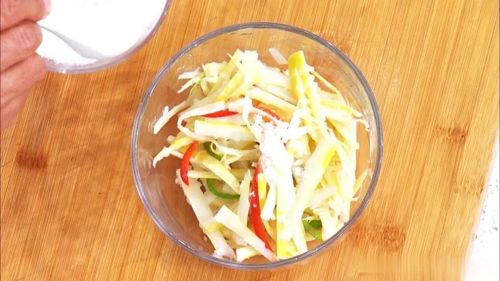 春笋切丝,按照前文方法,焯烫1分钟,临出锅前把青红椒丝也下入水中烫一下,一起捞出过凉水。