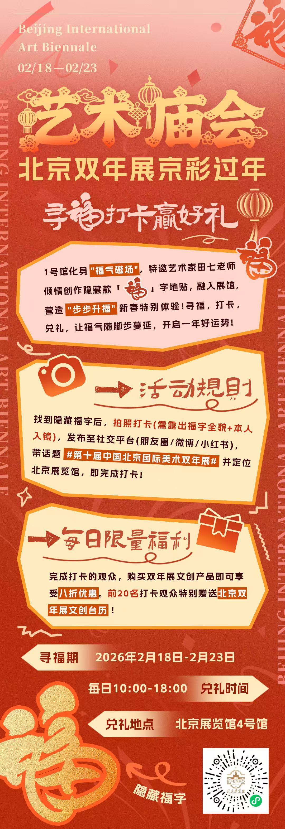 2.18-2.23来北京展览馆!在1号馆寻找田七老师创作的隐藏「福」字地贴,拍照(露全貌+本人入镜)带话题#第十届中国北京国际美术双年展# 并定位发布,即享文创8折!每日前20名赠台历,兑礼在4号馆(10:00-18:00)。来北京双年展京彩过年,步步生福。更多信息敬请关注官方发布。现在,上“乐享北展”小程序或美团等平台搜“北京双年展”购票,还有亲子联票优惠哦~错过等两年。