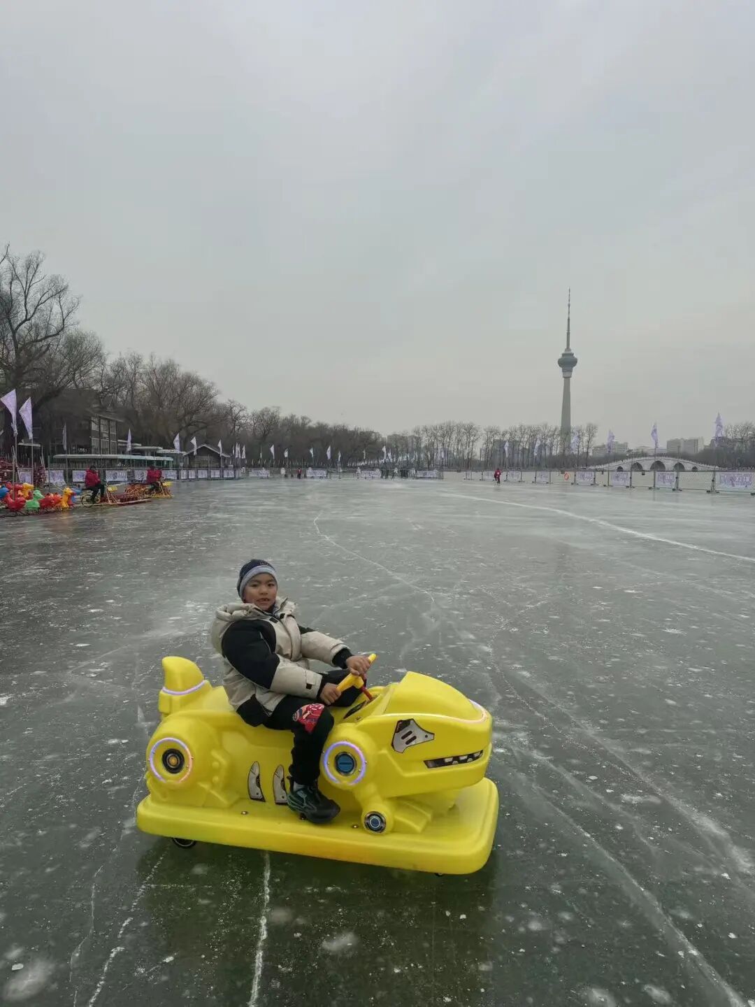 冰场以东湖南码头为界划分为东、西两区,1400辆各式冰上娱乐设施满足不同年龄段的游客需求。其中西区主打经典冰上项目,如传统的冰车、冰上自行车、“雷霆战车”等;东区还增添了卡通电动冰车、狗拉雪橇冰车等。
