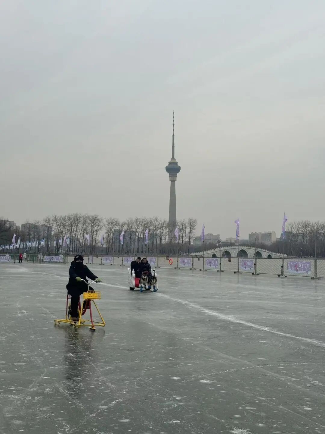 上午10点多,玉渊潭公园东湖南岸的冰场上,滑冰车的、骑冰上自行车的、驾驶狗拉雪橇冰车的……大小游客们在冰面上玩儿得不亦乐乎,尽情享受冰上项目的快乐。