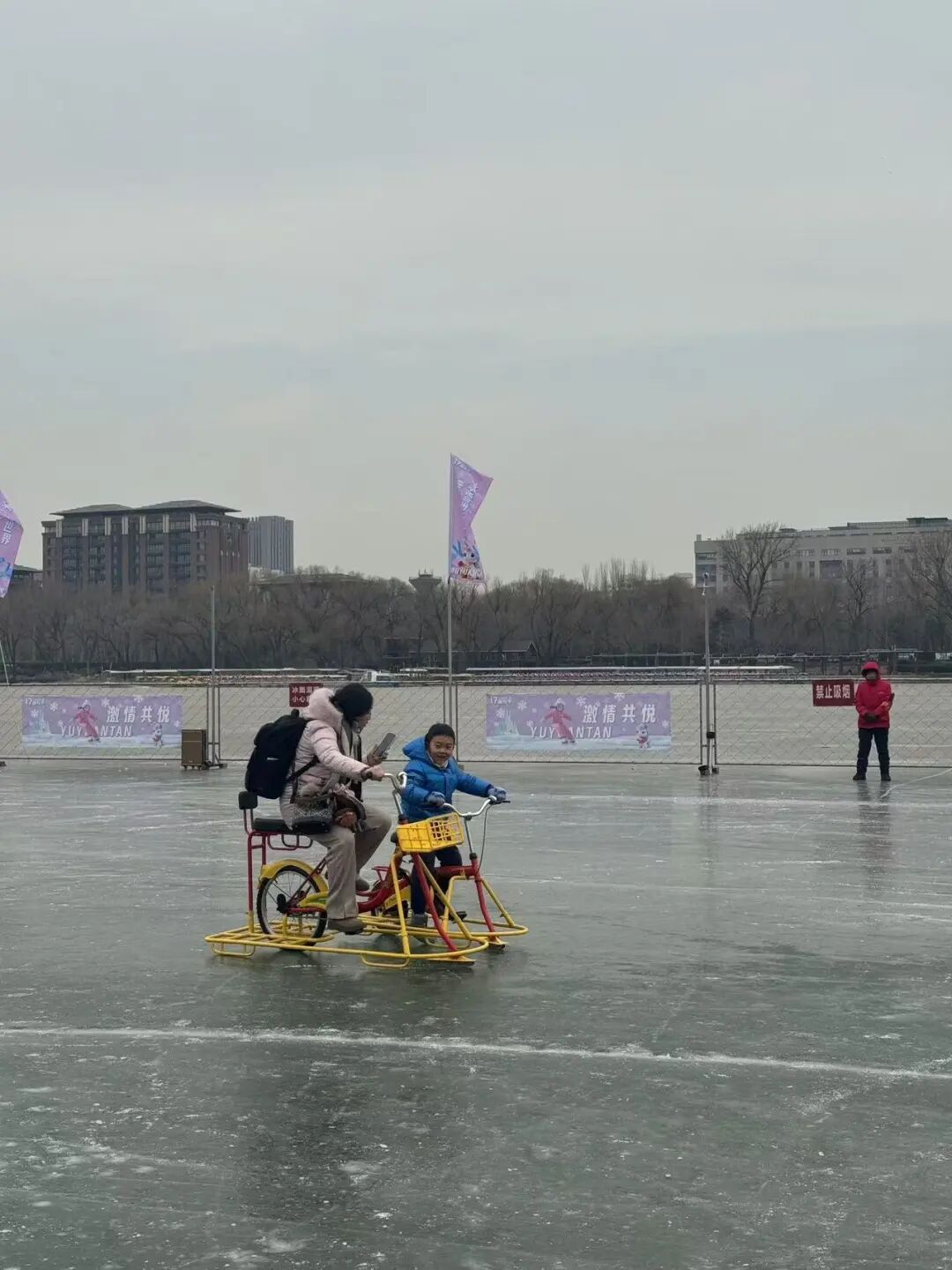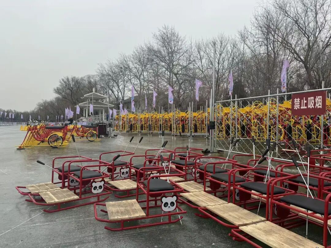 玉渊潭公园东南冰场负责人李梓旭介绍,现在有单人冰车、双人冰车、卡通、冰车、冰上自行车、电动狗拉雪橇、电动冰车等共计850辆,其中有50辆是双人冰车,最大瞬时承载量是900人。冰场为游客提供了免费的热水、应急救援箱,全场实施封闭管理,并严格控制瞬时承载量,确保每个游客能有充足的冰面进行玩耍。公园每天安排安全员、救护员进行冰面巡视,对冰层厚度进行多点位、多次测冰,时刻保障游客的安全。