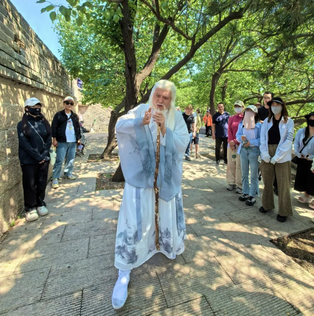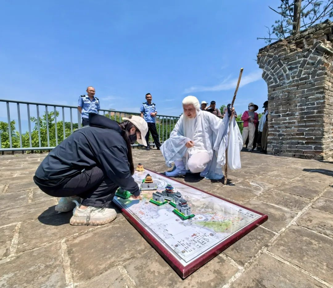 在这场沉浸式长城之旅中,游客化身成为长城“有缘人”,通过绿色通道乘坐地面缆车穿过林海,抵达南线地面缆车出口。一位身着长衫、手持拂尘的“锁钥仙翁”笑语相迎,他轻挥衣袖“施法”,用一套行云流水的动作打开时空之门,将游客拉入历史长河。