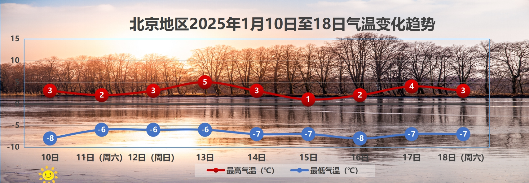 预计2025年1月10日至18日期间,南郊观象台最高气温1~5℃,最低气温-8~-6℃。