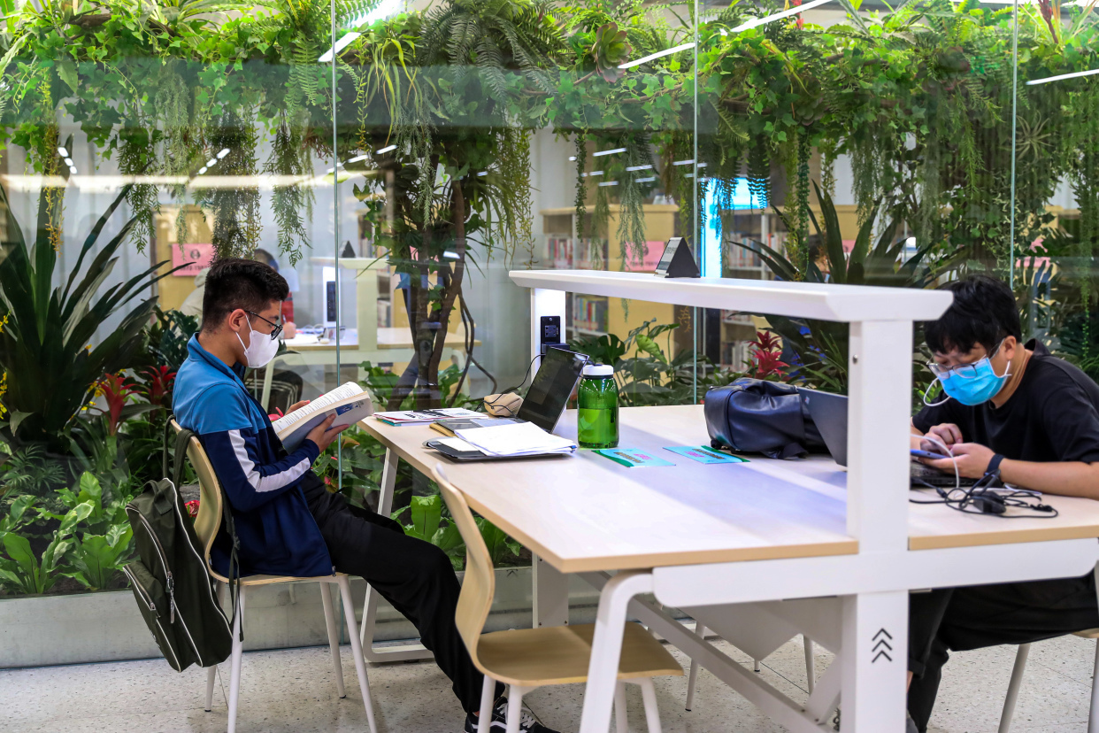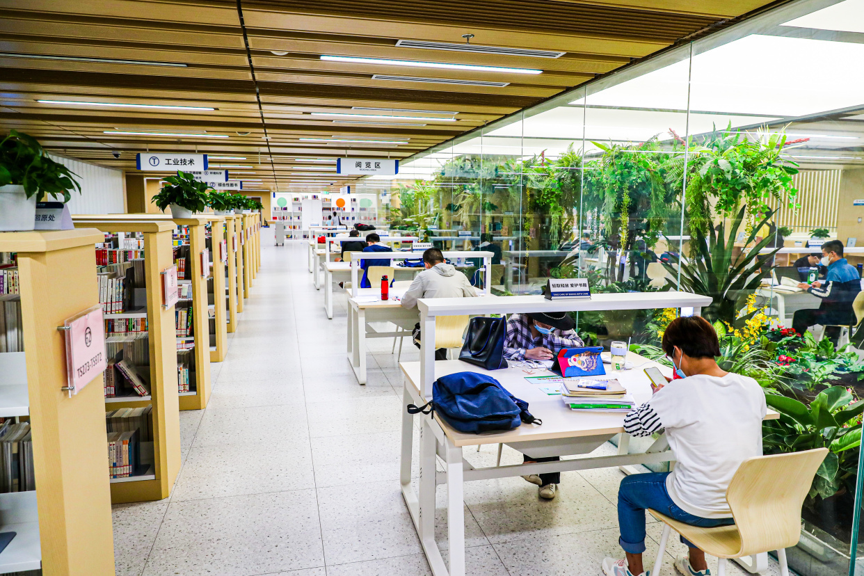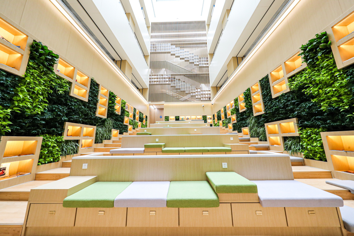 除此之外,图书馆新馆在整体建筑布局突出空间美学及环境美感,以竹简、宣纸等元素设计的竹林入口颇具古韵。每层的阅览区分别以“四时画廊”为主题设计了绿植景观,图书馆内绿植覆盖率近10%,可以说,无论你坐在哪里读书、学习,疲惫时只要抬起头都可以看到绿色景观植被。