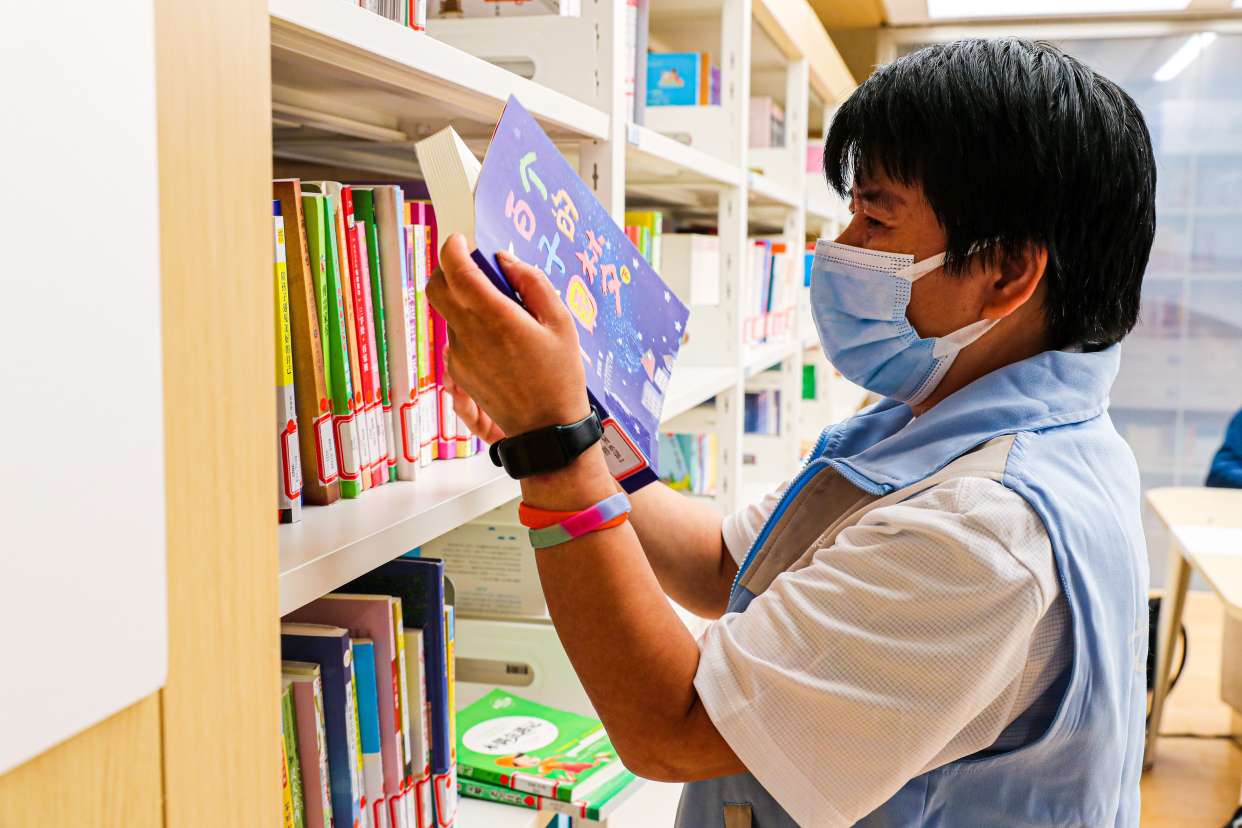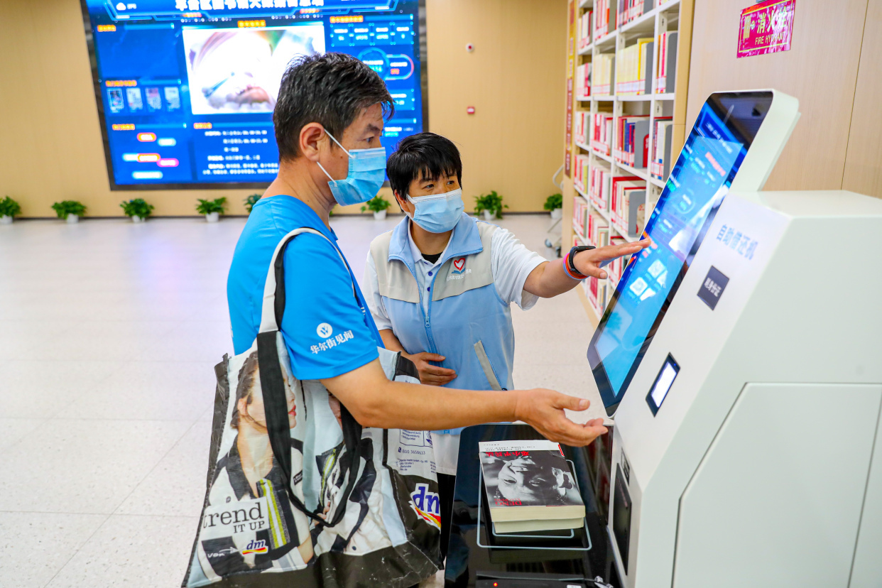 今年54岁的英淑芬正在协助群众在自动借还机上办理图书借阅,家住看丹桥的她每天早9点到晚7点在这里担任公共图书馆文化志愿者。“我很喜欢在图书馆看书的氛围,前段时间知道丰台图书馆新址开门了,就过来服务台报名了志愿者,整理书架、引导帮助大家借阅图书,在这里我一整天心情都很好。”
