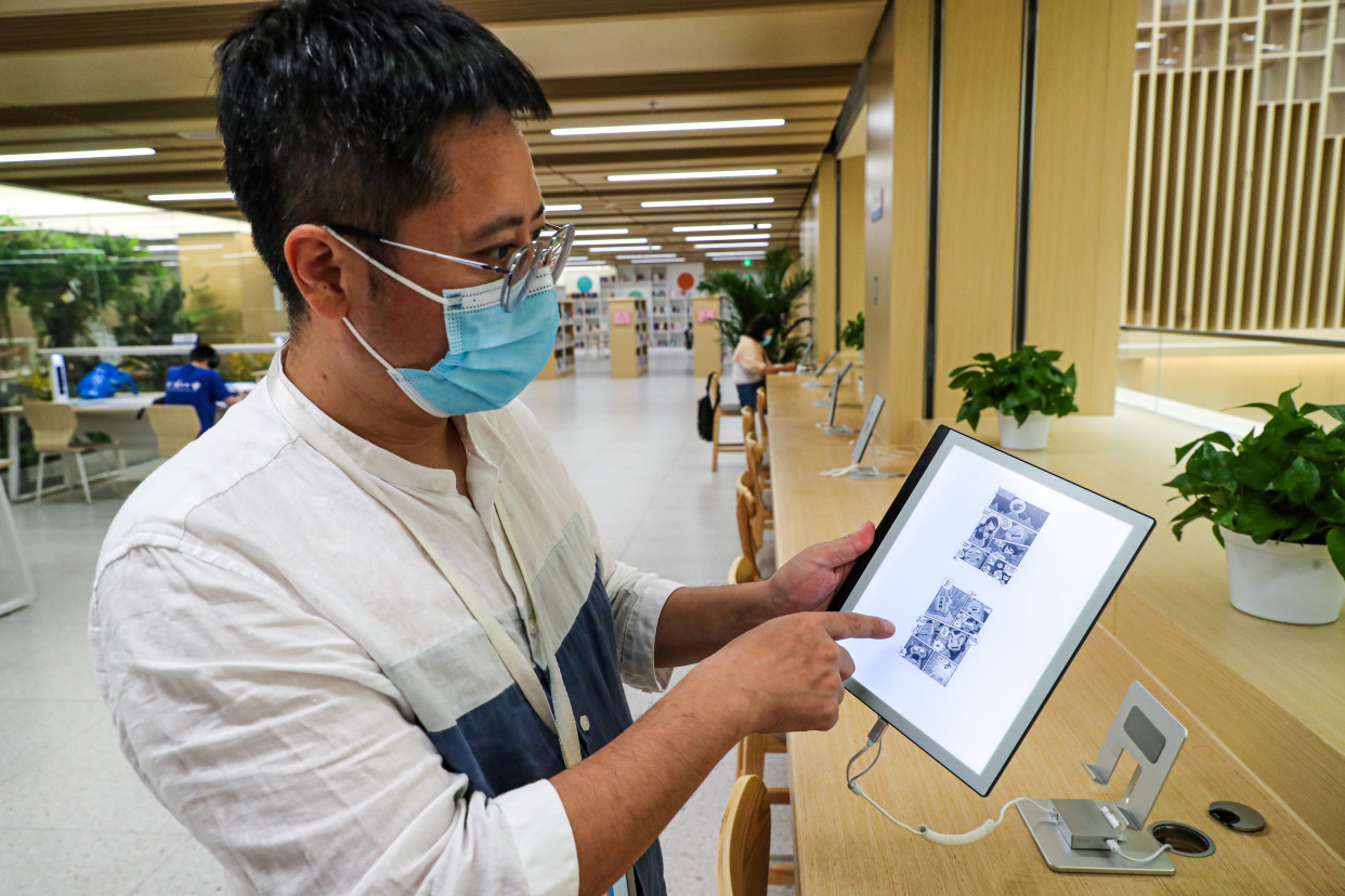 在图书馆新馆二层阅览区,记者看到一排围绕中厅而建的长桌,桌上摆放着40余台电子阅览器,读者只要打开登录,点击书城下载自己喜欢的书籍便可以免费在电子阅览器上阅读。电子书城收录有近十万册书籍,既有时下点击量最多的建党百年相关书籍,也有适合小朋友阅读的航空科普绘本。