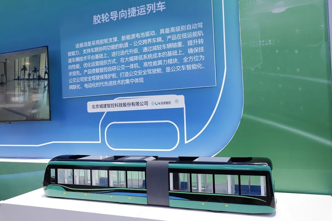 城建智控的胶轮导向捷运列车模型,展示出企业高效低碳的轨道交通解决方案。