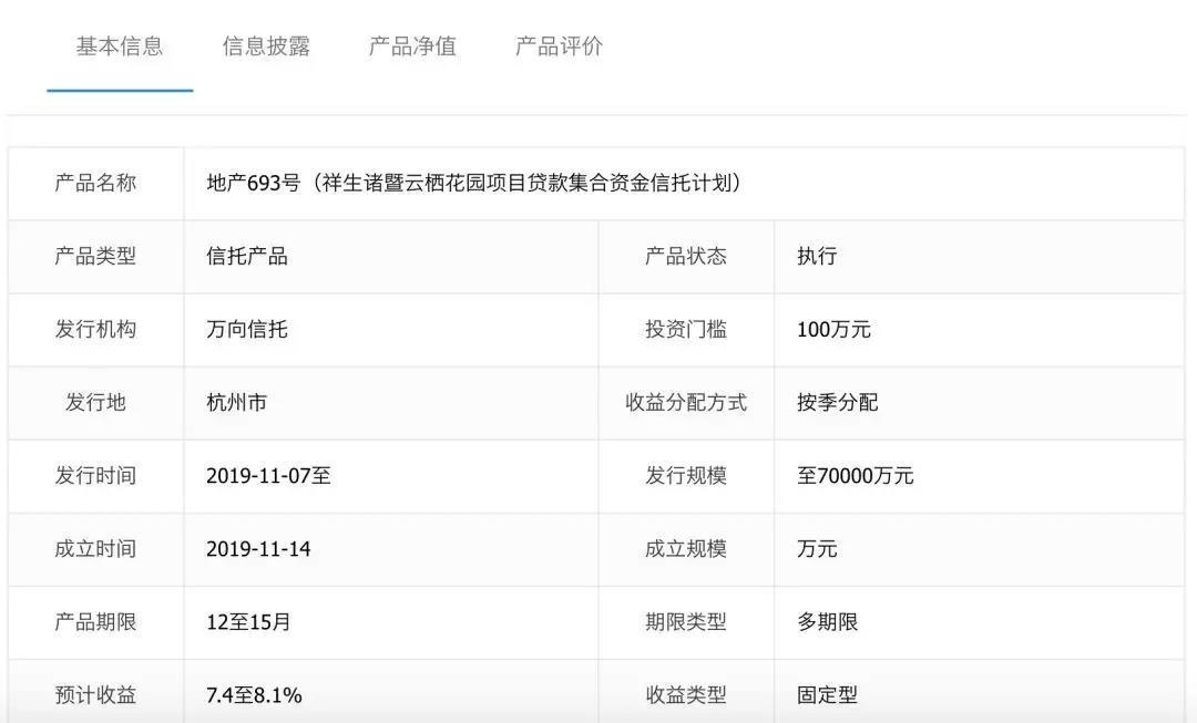 “地产693号(祥生诸暨云栖花园项目贷款集合资金信托计划)”融资方为诸暨祥生宜瑞置业有限公司(下称“祥生宜瑞”),发行规模为7亿元。祥生宜瑞成立于2019年4月,注册资本2000万元,是祥生地产100%控股的下属公司。官网介绍称,信托资金用于向祥生宜瑞发放信托贷款,贷款资金用于诸暨祥生云栖花园项目的开发建设及贷款人同意的其他用途。