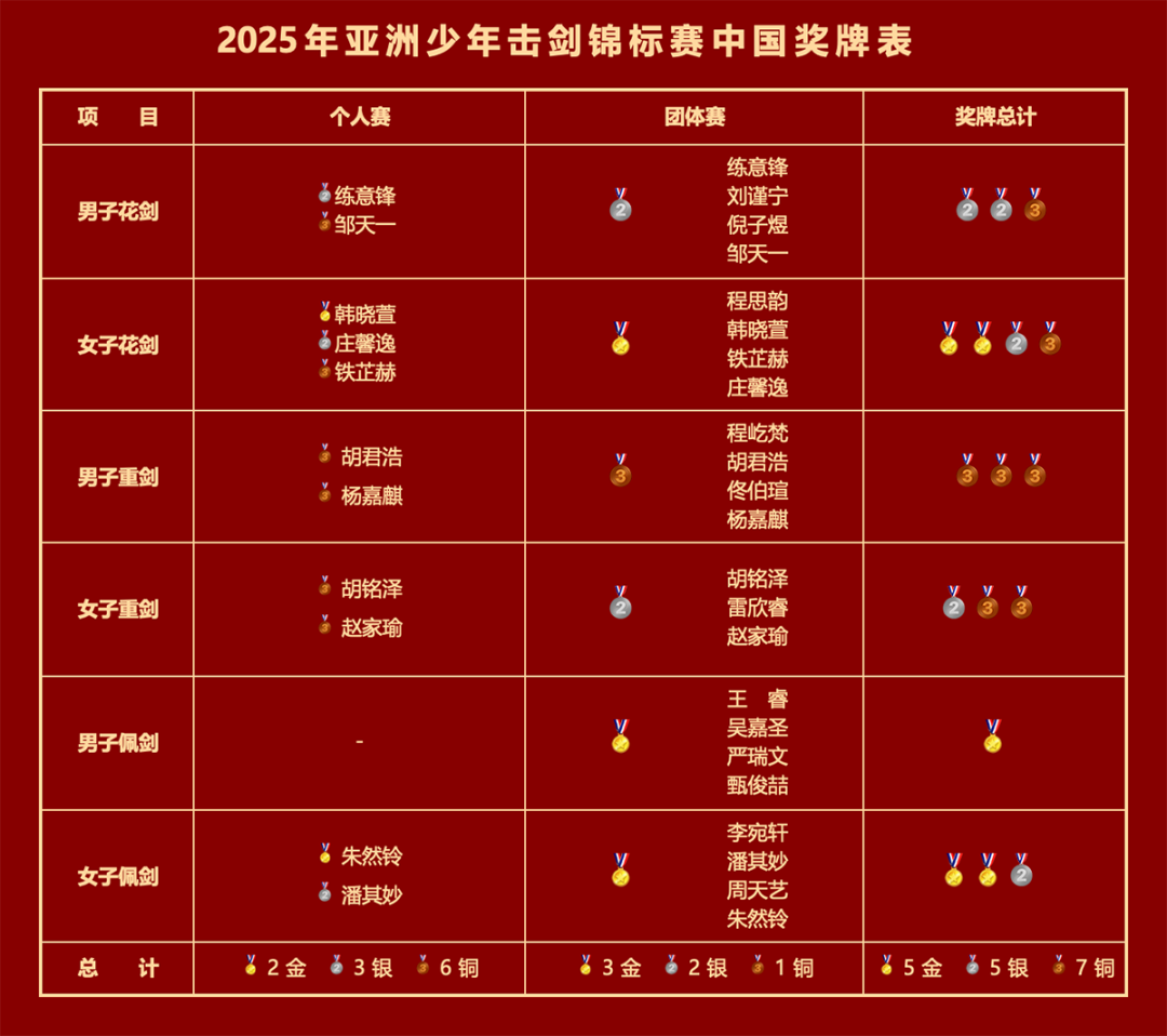 2025年亚洲少年击剑锦标赛中国奖牌表。