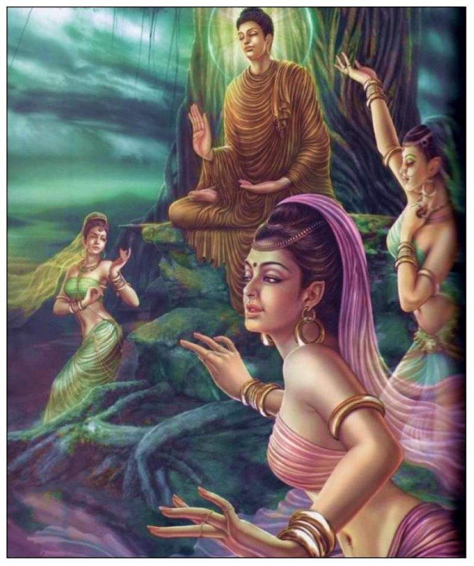 释迦牟尼即将成佛,祥光上冲死亡与欲念之魔的魔宫,魔王波旬想阻挠他圆成佛果,便命令三个魔女前去蛊惑他。
