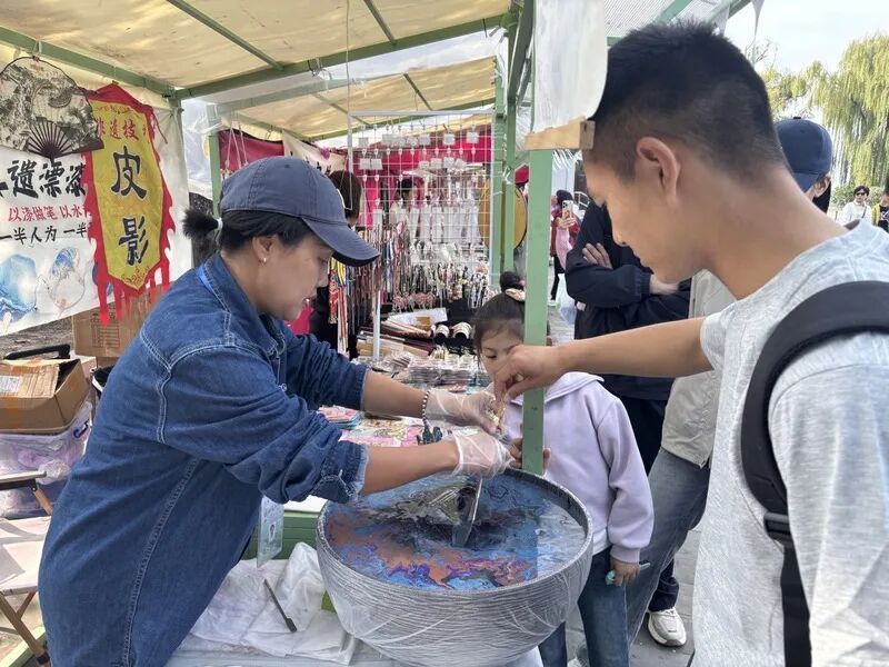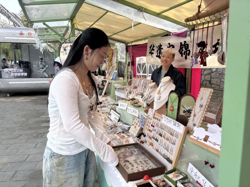 在颐和园八方亭附近,非遗宋锦、非遗漆扇、老北京翻花等摊位前围满了人,精致的饰品、创意十足的的冰箱贴……令人眼花缭乱。