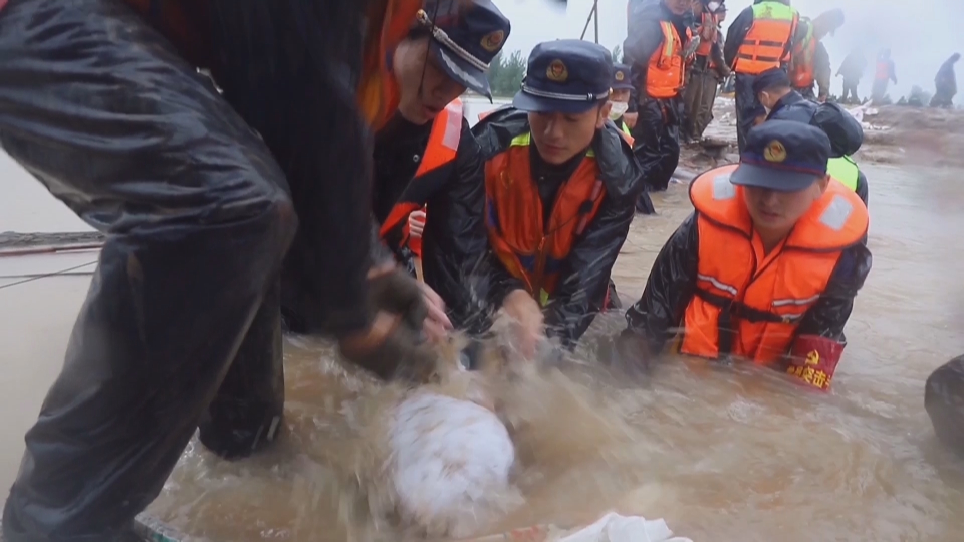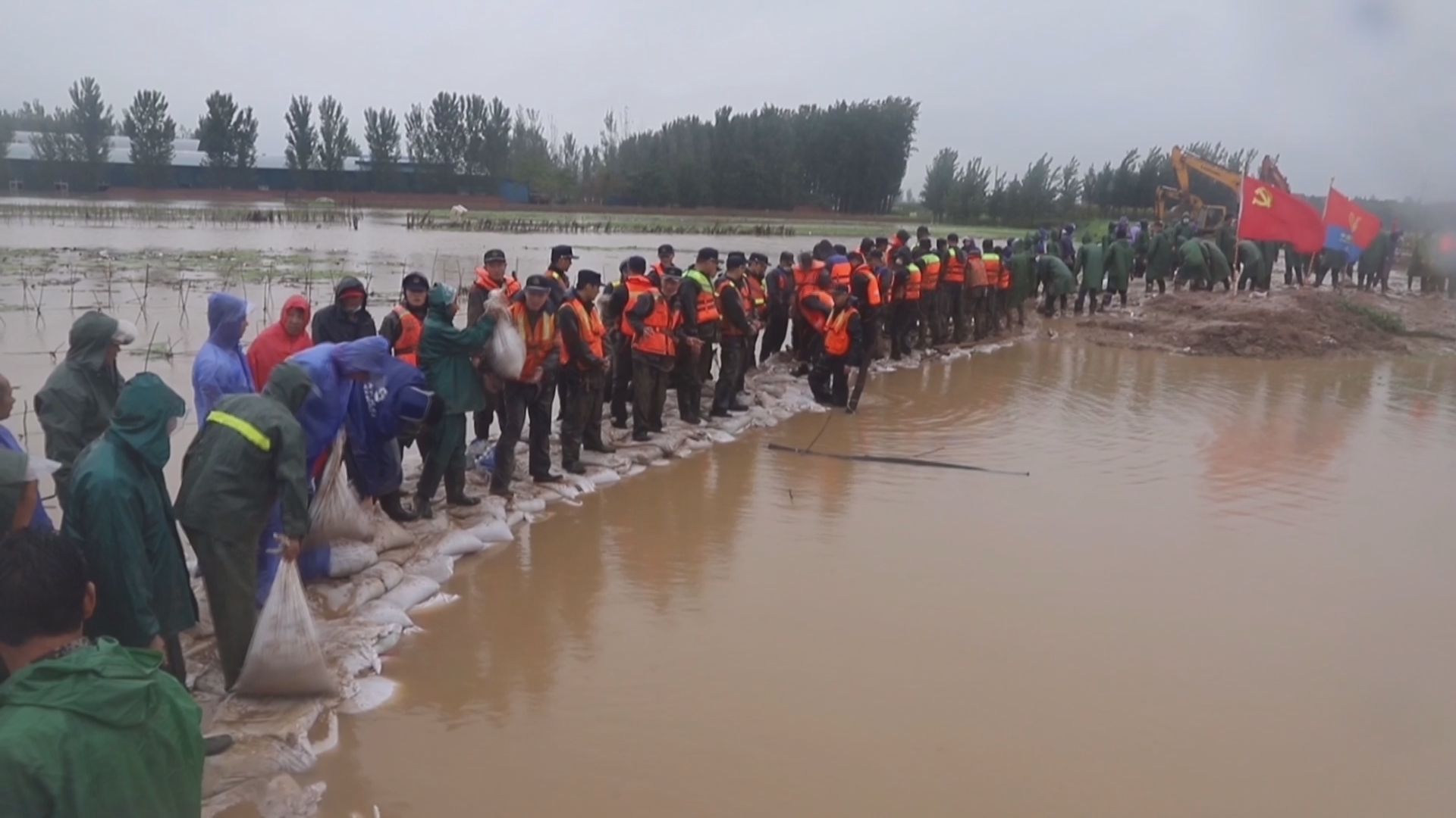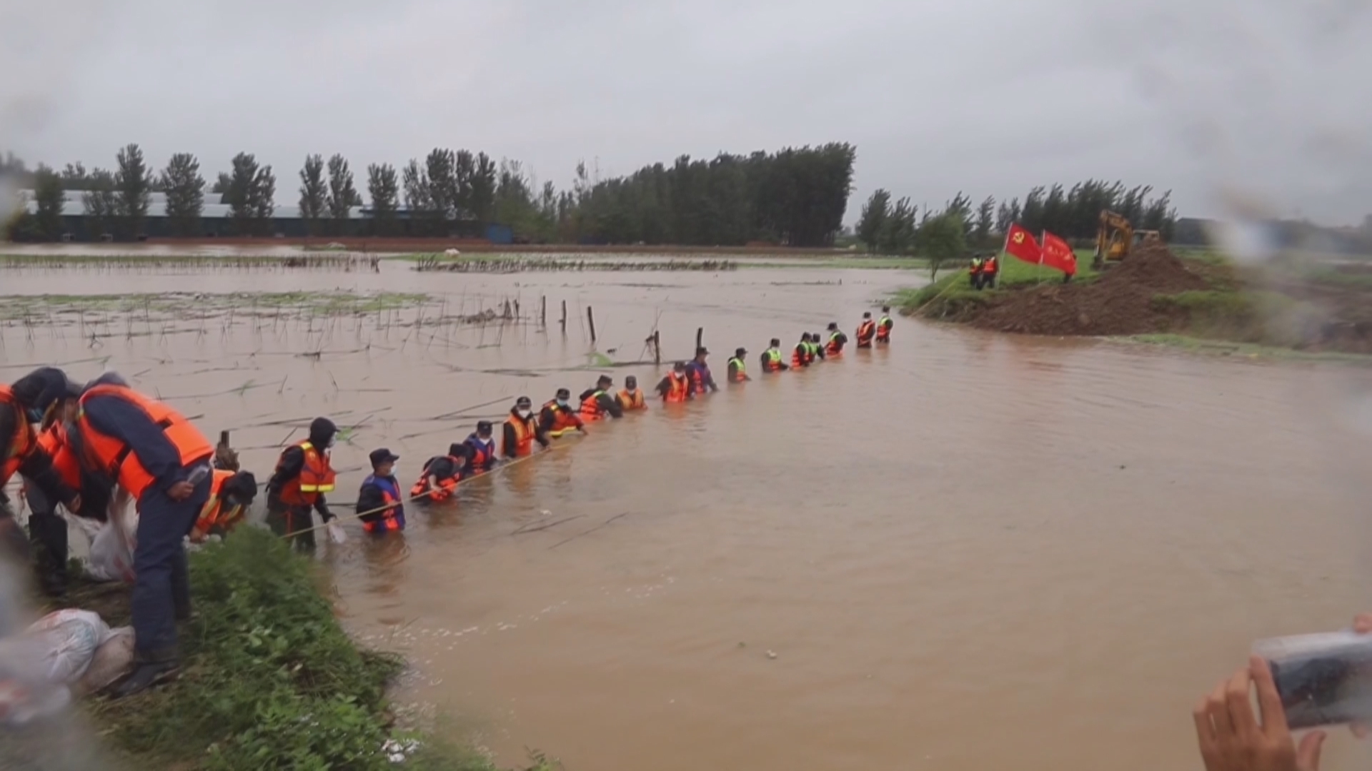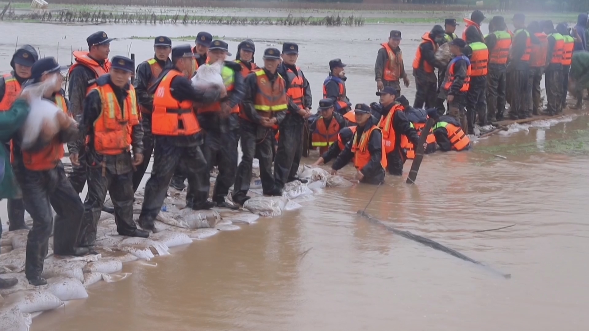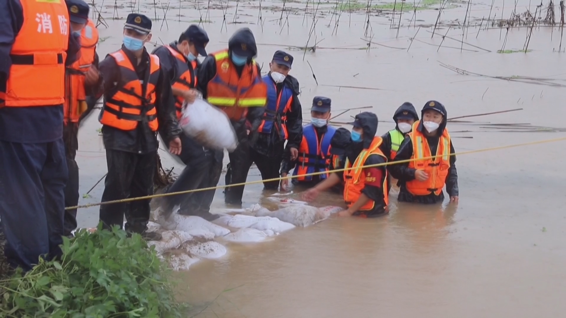 由于河堤淤泥太深,挖掘机频频陷入,无法靠近,只能靠人力手抱、肩扛沙袋;水流湍急,消防指战员在洪水中筑成“人墙”,防止沙袋冲走。
