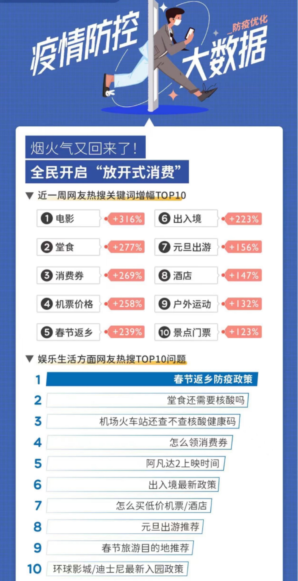 随着民众生活节奏的恢复,生活的“烟火气”又回来了。大数据显示,民众的“放开式消费”热情高涨,电影、餐饮、消费券等搜索热度上升。同时,随着全国各地防控政策逐渐放宽,积攒许久的出行需求开始释放。数据显示,机票、酒店、景点门票等颇受关注。元旦、春节出行开始提上日程,返乡过年、出行政策、春节旅游目的地等问题受热议。
