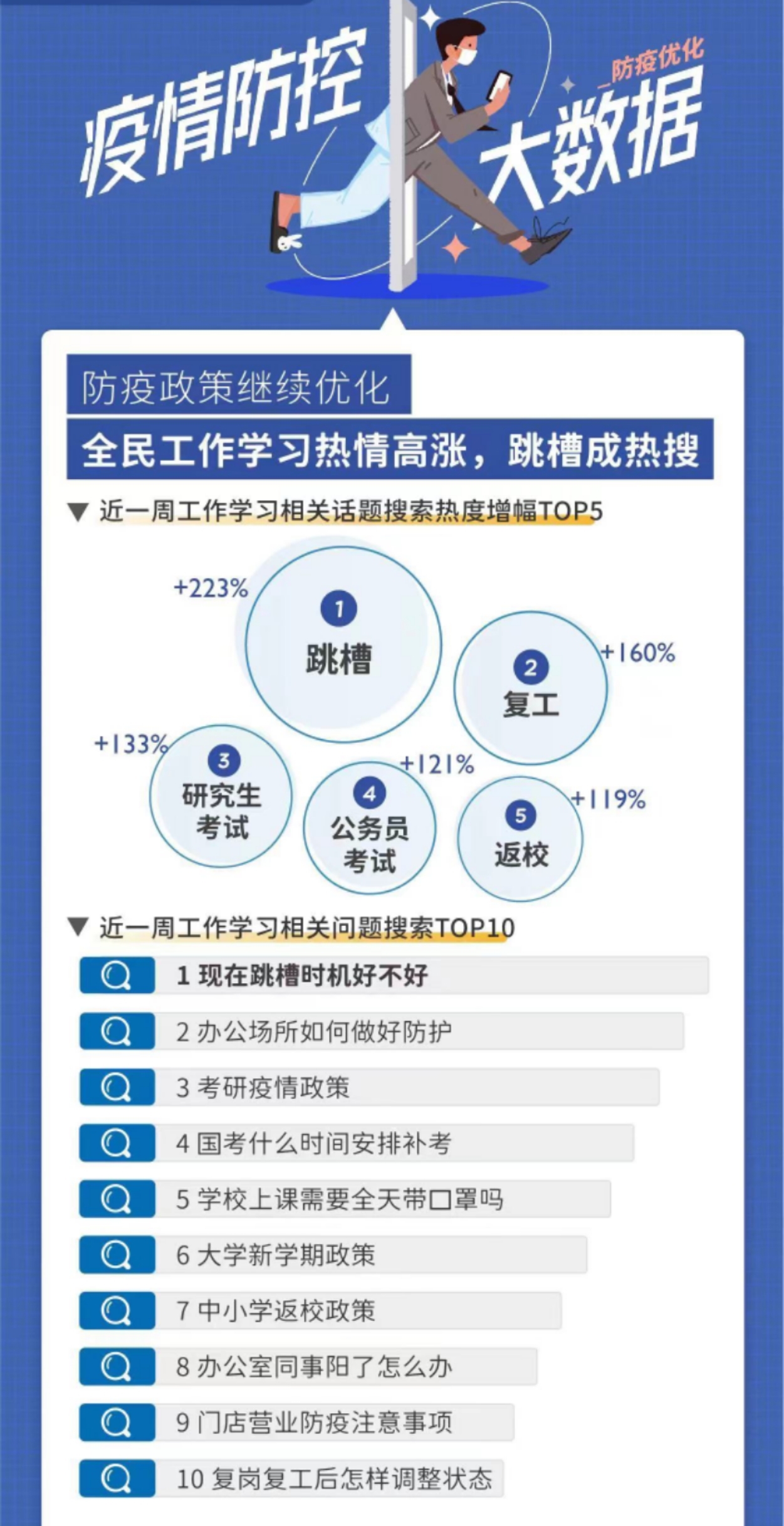 大数据显示,最新疫情防控措施陆续发布后,人们的自我防疫意识正在增强,对待疫情也日趋理性科学,如疫情防控“新十条”最受关注,防疫相关物品搜索量暴增;民众复工复学热情高涨,相关内容搜索热度暴涨,“跳槽”竟意外收获大量关注;娱乐生活方面,电影、餐饮、消费券搜索热度暴涨,元旦、春节出行防疫政策也是居民关注焦点。