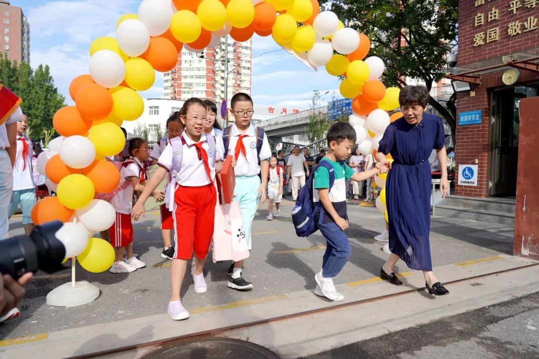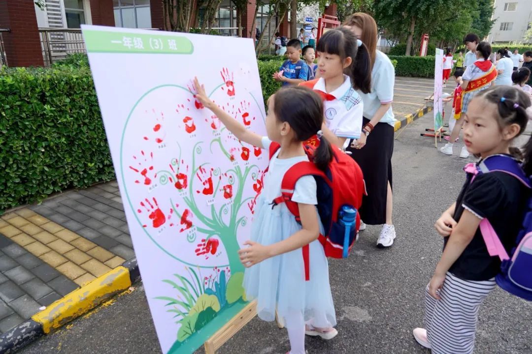 校长和老师们早早来到校门口欢迎学生们的到来。为迎接一年级新生,老师们精心布置了气球拱门和拓印成长树,仪式感拉满。