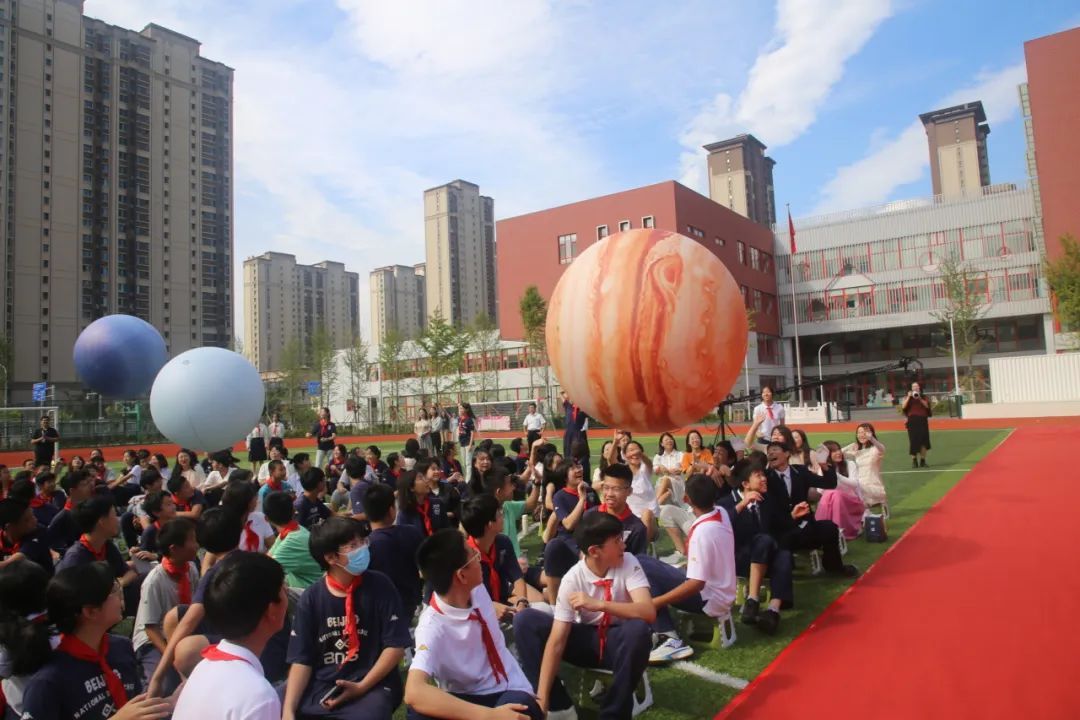 穿越太阳系,师生们一起从操场的后排向前滚动八大行星。