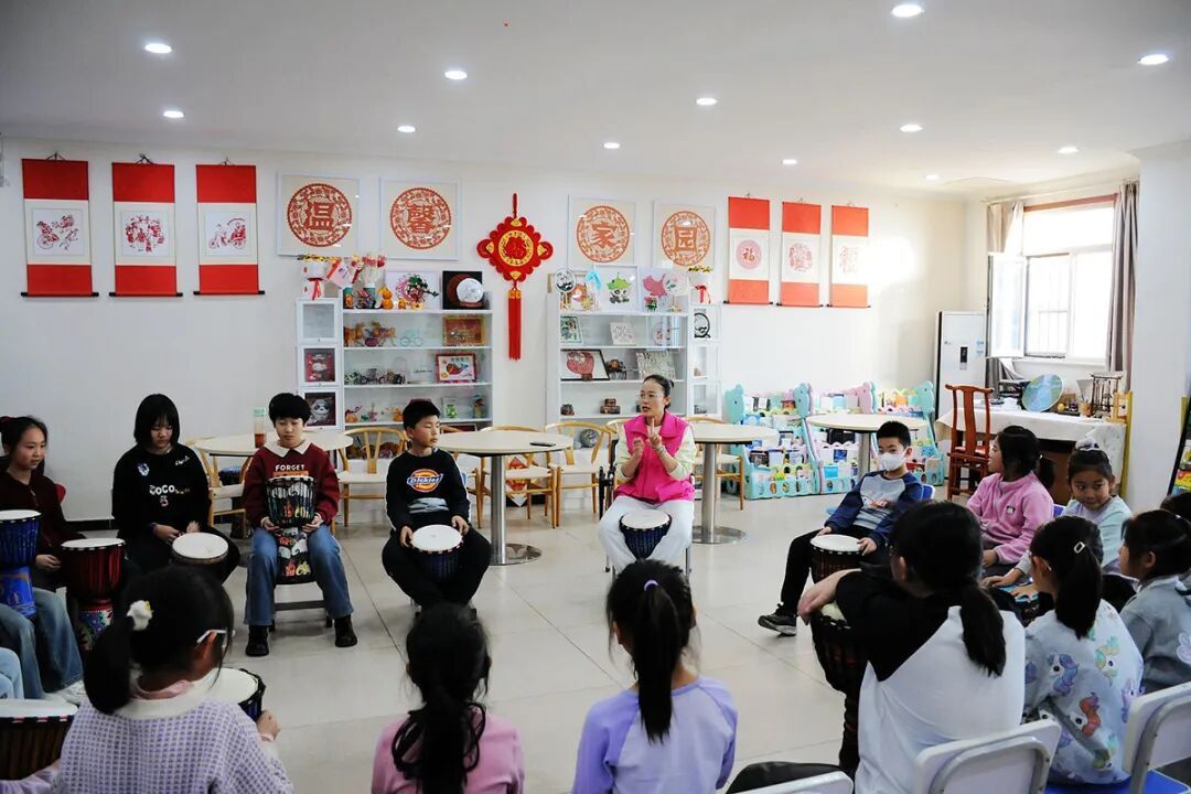 在石园街道石园北区第三社区乐器小课堂上,孩子们全神贯注地练习非洲鼓,感受节奏的魅力。