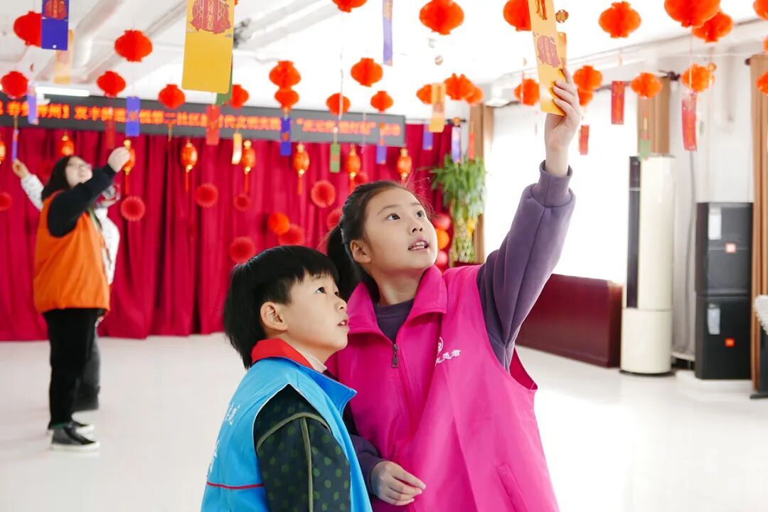 双丰街道香悦第二社区巾帼志愿阳光站内,孩子们乐猜灯谜,在传统文化中友好互动。