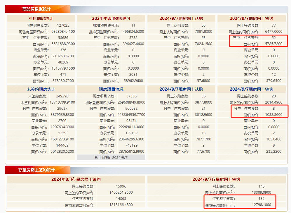 根据北京市住房和城乡建设委员会数据:9月7日,北京新房住宅网签60套,网签面积6819.08㎡,二手房住宅网签135套,网签面积12798.1㎡。