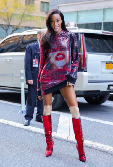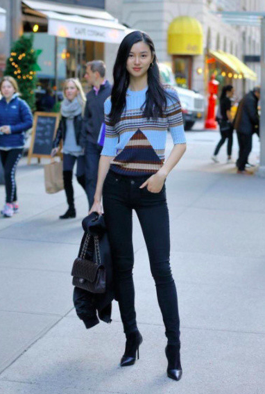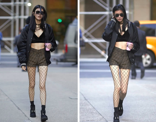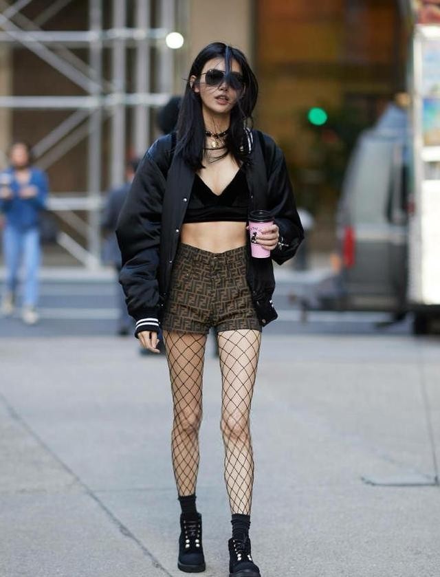 街拍图中,奚梦瑶穿着黑色外套,内搭短款上衣,下身穿着超短裤,还有这显眼的渔网袜,有网友忍不住吐槽:“奚梦瑶跟个路人网红似的,一点超模的味道都没有。”还有网友称奚梦瑶的穿着辣眼睛。