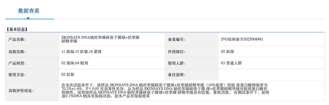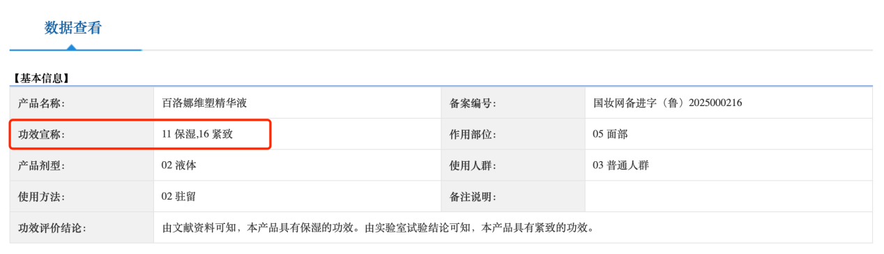 根据国家药品监督管理局信息,该产品备案时间是2025年4月28日,境内责任人是青岛欧泊生物科技有限公司,备案可宣称的功效有保湿、紧致,作用部位是“面部”,使用方法是“驻留”。
