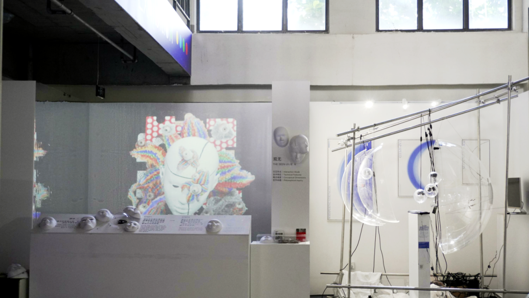 不仅有声音交互,双年展上还有光影交互。同样来自中央美术学院的弭骏依展出《观·无》,散落的洁白面具空灵而神秘,作品引入机器人视觉作为媒介,将观众的手势动作转化为算法语言,像万花筒一样在墙上投影出日常、梦境、机械、精神四重空间影像。弭骏依说:“通过手势交互触发投影的虚实变化,探索感知与现实的边界。每一次交互既是探索,也是人与机器对现实的重新诠释。最终,肉身经验与人工智能共同揭示隐藏的‘世界面’。”