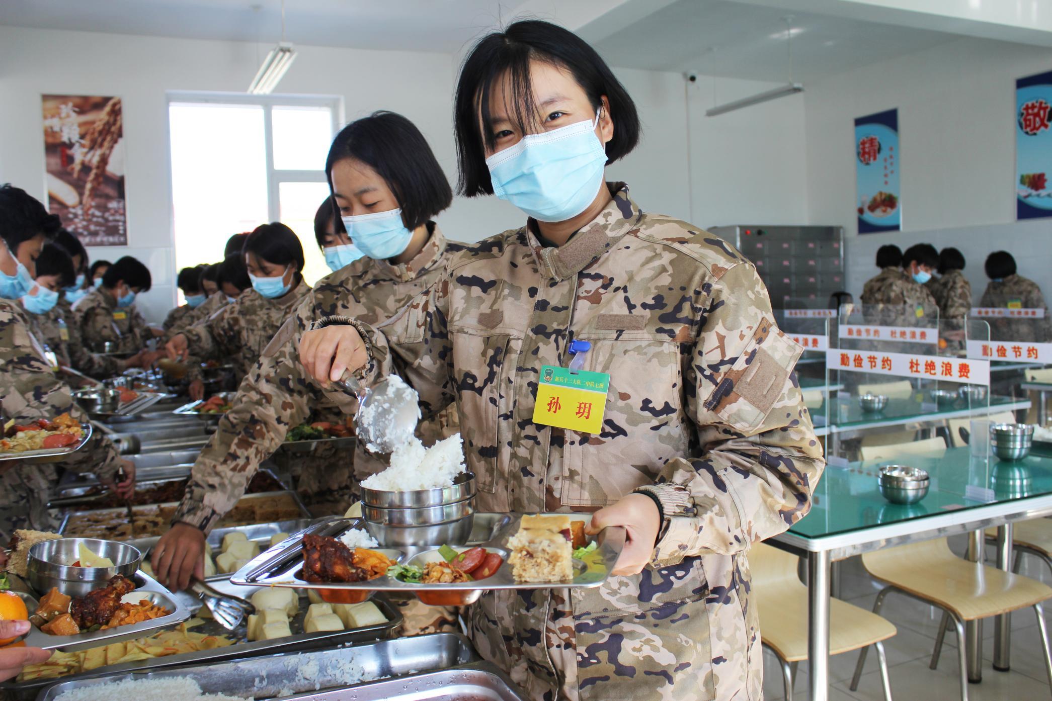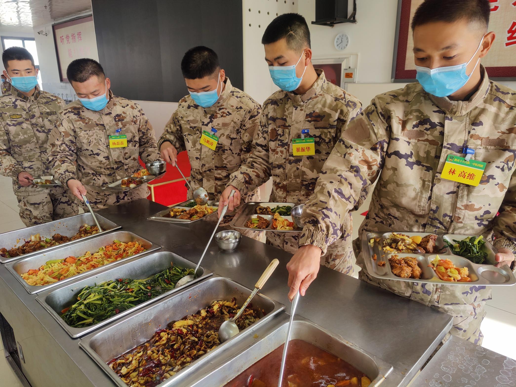 为了增强新战士们的满意度新兵团定期组织伙食测评,收集官兵意见建议,组织炊事班加强学习研究,严格落实伙食管理各项制度,坚持粗菜细做、细菜精做,确保了营养搭配均衡、色香味道俱全。
