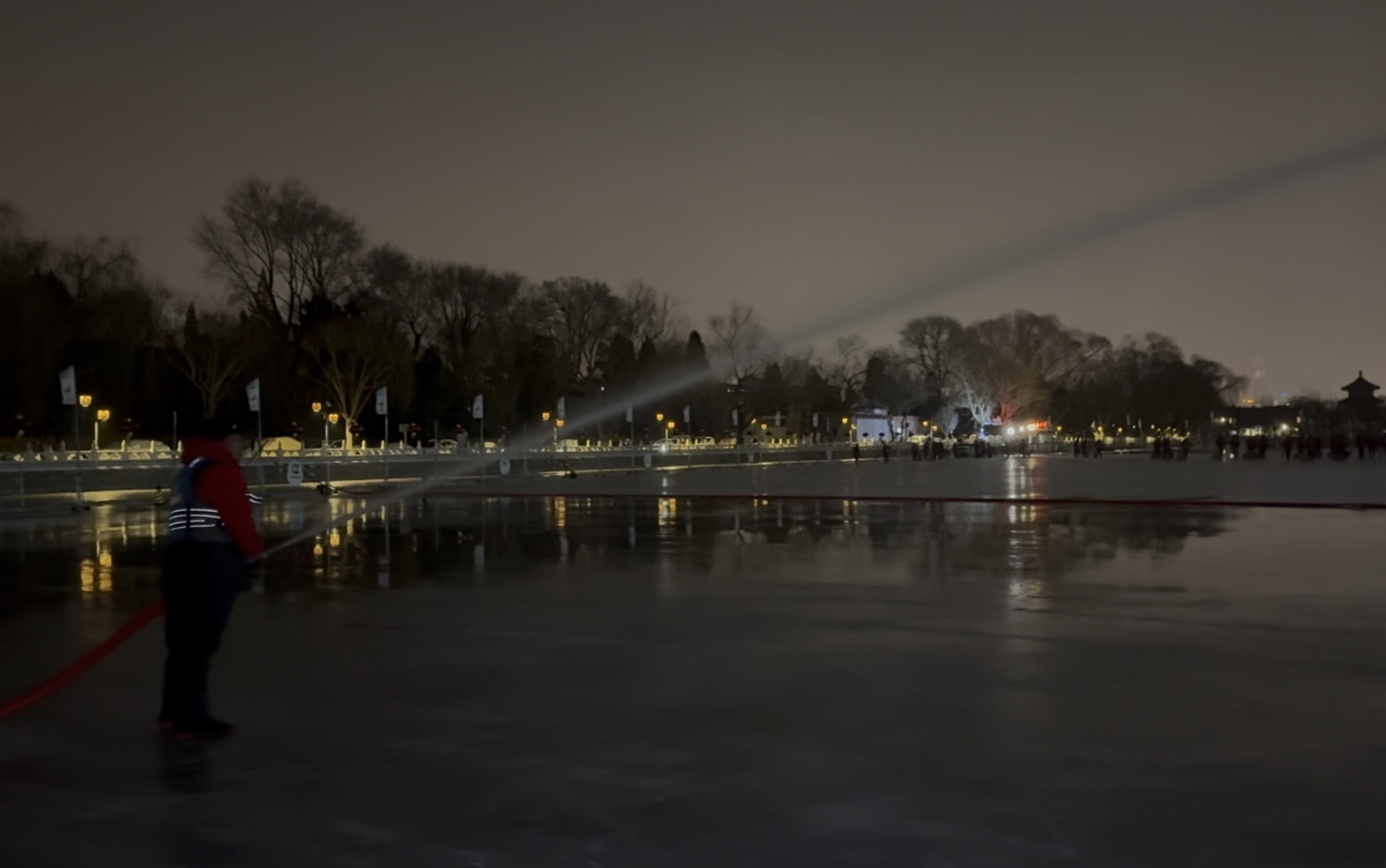 直到整个冰面被薄薄一层新水覆盖,冰场的工作才算接近尾声。什刹海冰场负责人干从雨说: