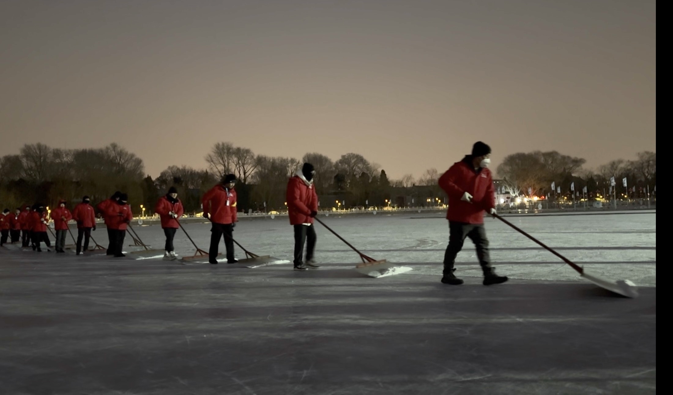 这些正在清理冰面的工作人员手持冰铲,呈一字排开。白天他们或是售票员或是安保员、巡逻人员,入夜后都化身修冰人。随着冰铲的推动,冰面的浮雪被尽数带走。干从雨表示,虽然每天的工作流程大同小异,但游客数量、冰面磨损程度不同,当天的工作也会适时调整。