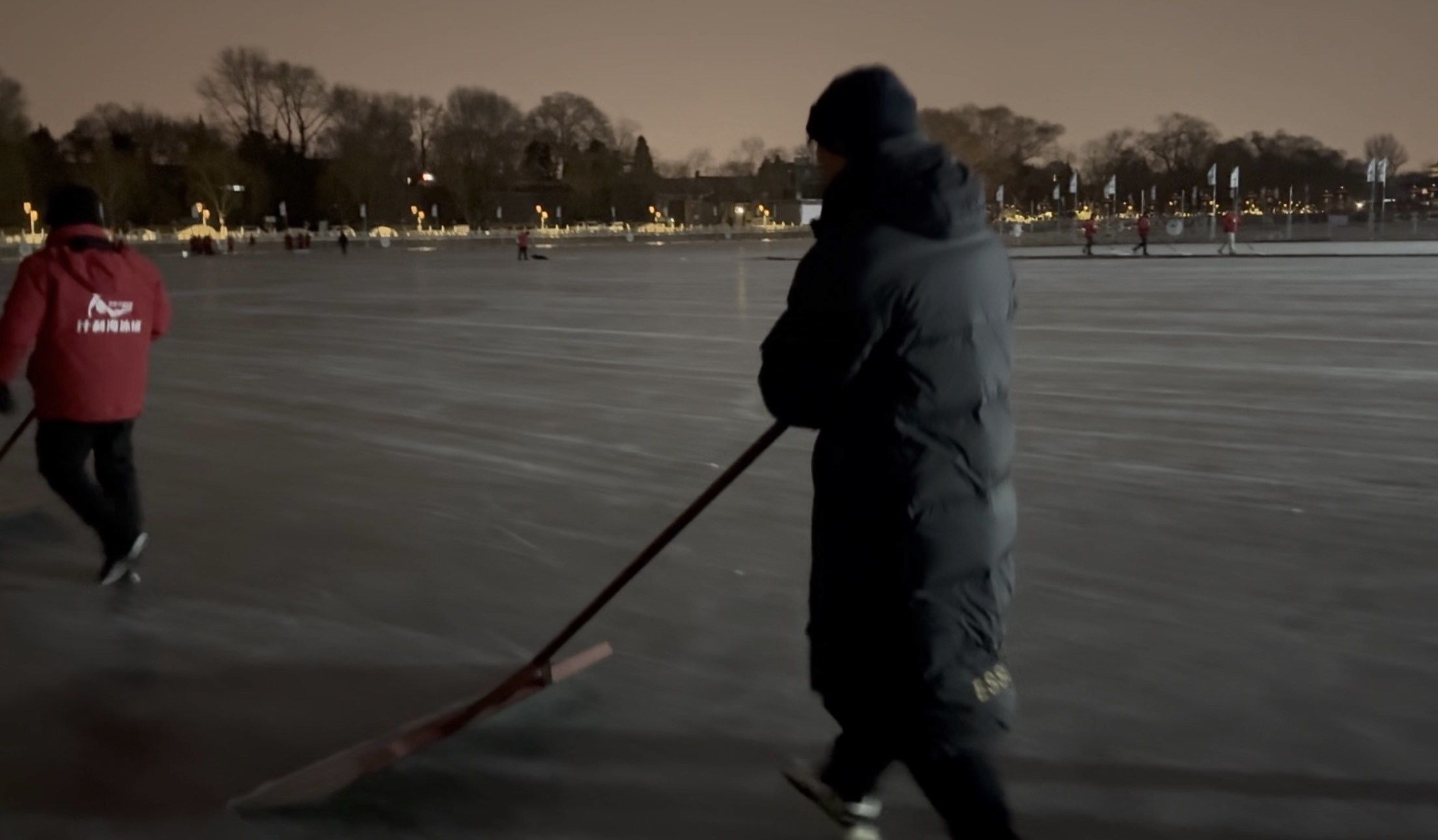 夜幕降临,随着最后一波游客三三两两离开冰场,什刹海速滑区的冰面上显现出冰刀划过的细密划痕,这既是白天冰场热闹的体现,也是第二天安全滑行的阻碍,冰场内只剩下忙碌的工作人员。什刹海冰场负责人干从雨介绍: