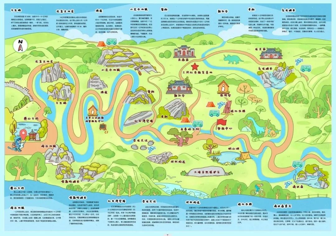 沿途风光:白河堡水库(燕山天池)、峰丛地貌、近直立底层、天生桥、卡斯特峡谷、干沟迎宾湖、六道河背斜、秀水湾村自然风光、红石湾穹窿、恐龙足迹,长寿岭村、奶山湖等