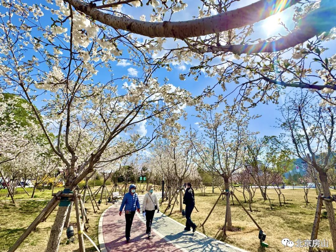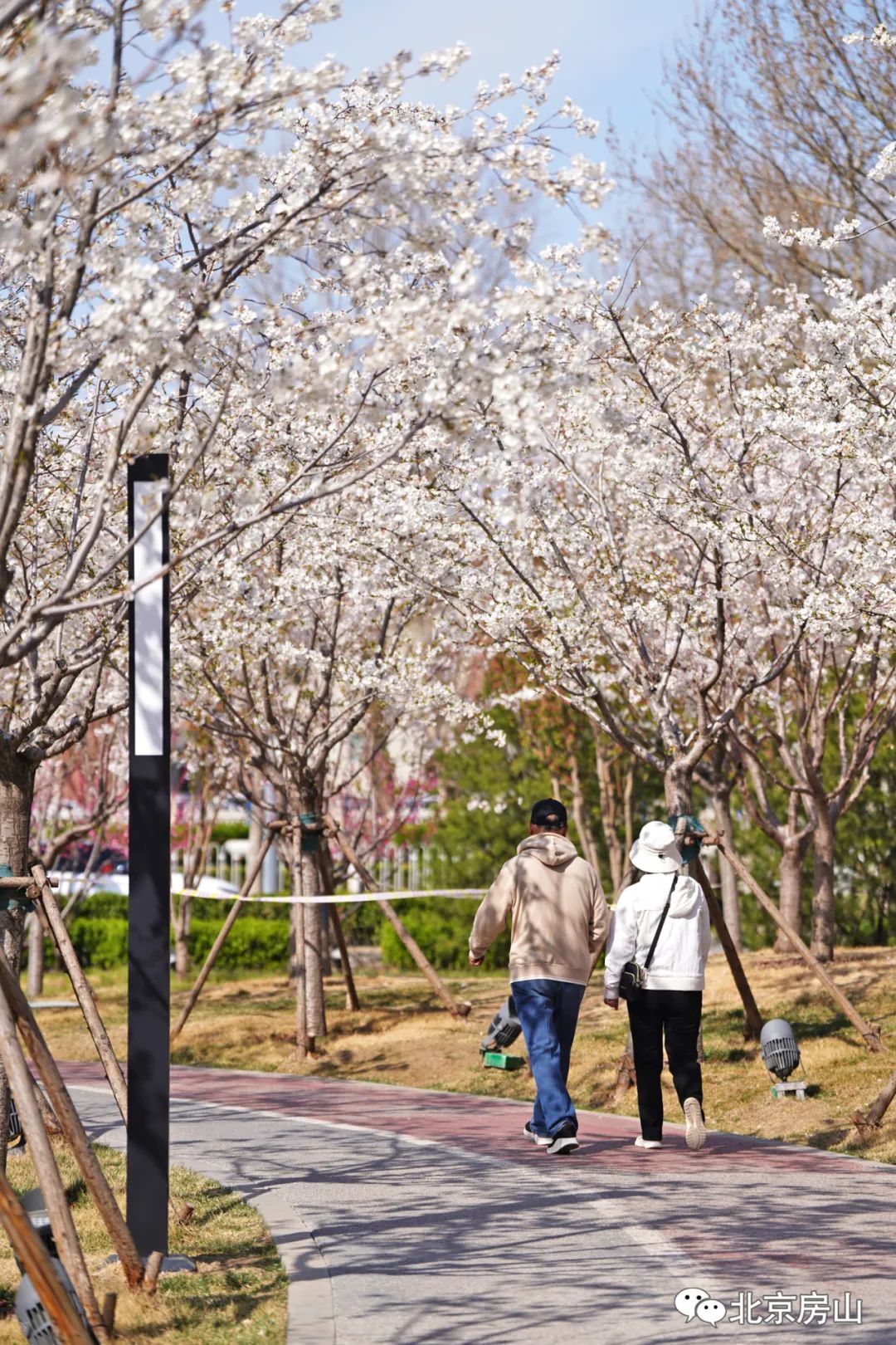 在房山人民公园,樱花大道的浅粉云霞刚染透枝头,海棠便迫不及待地捧出满树珍珠白。微风轻拂,花枝摇曳,带来阵阵馥郁花香。花瓣翩然飘落,宛如一只只灵动的蝴蝶,为人们演绎着春天的芭蕾。