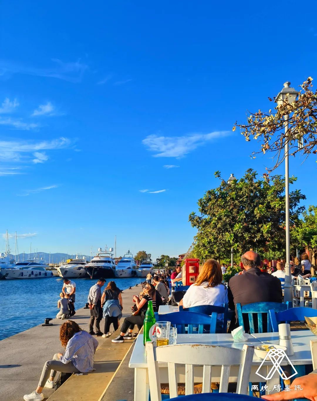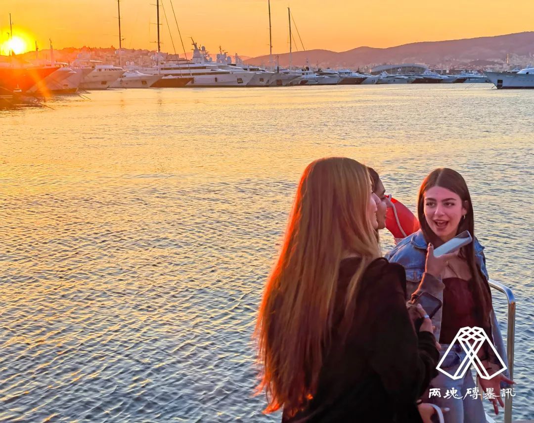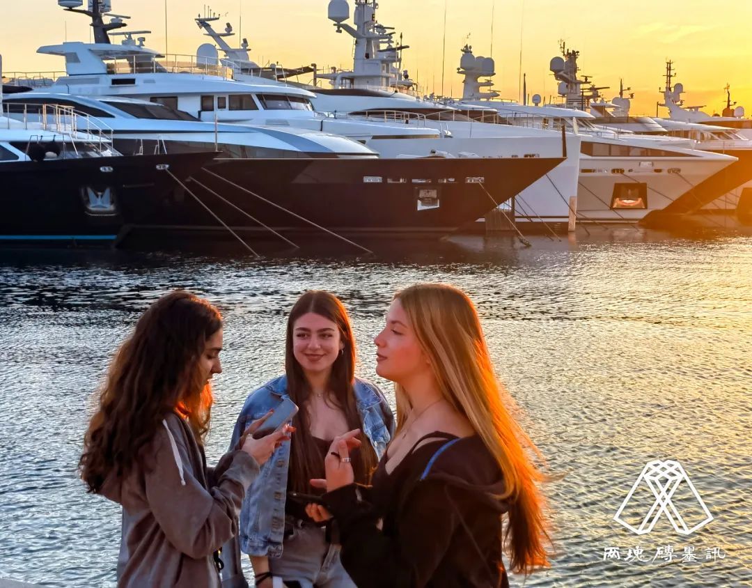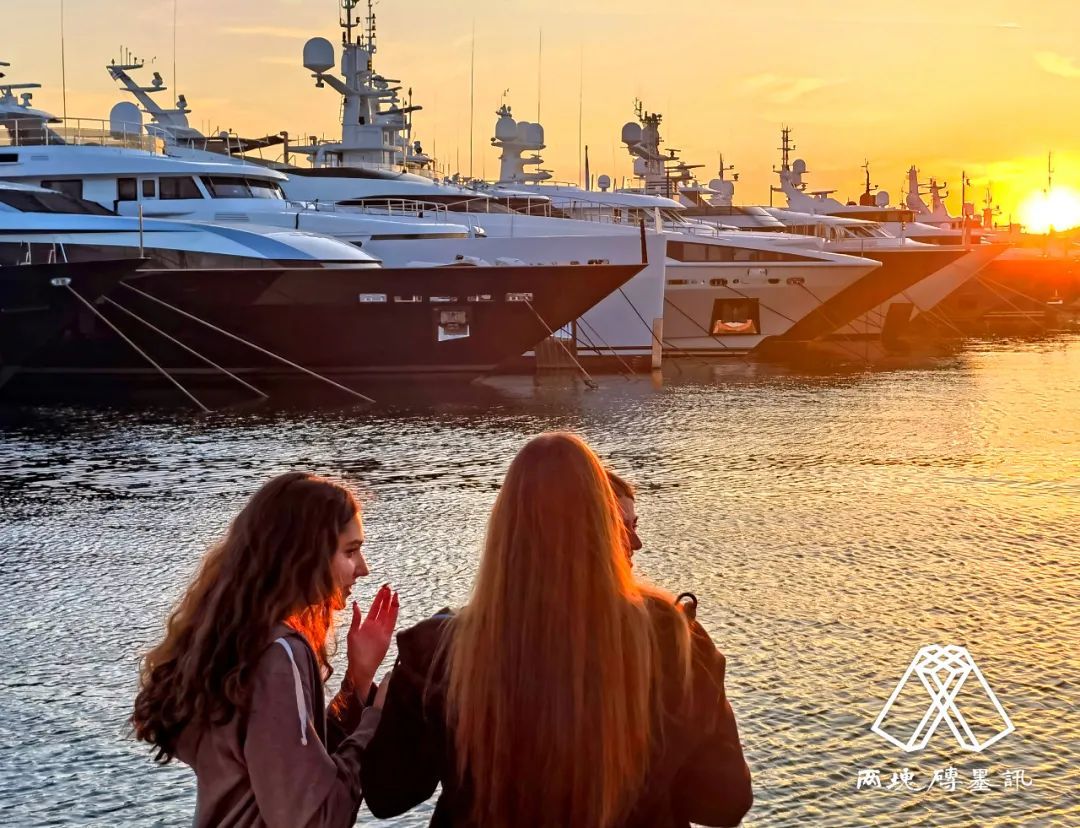 在游艇码头晚餐,夕阳西下,水面流光溢彩。鸥鹭翔集,花红树绿,一派和平景象。有三位少女说笑着从面前走过,用手机拍了她们,真美啊。