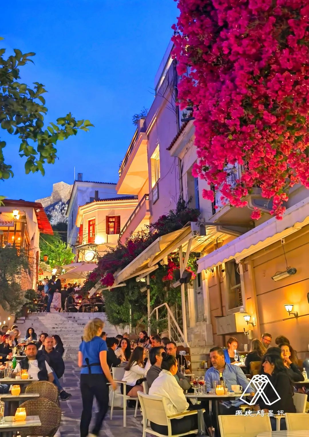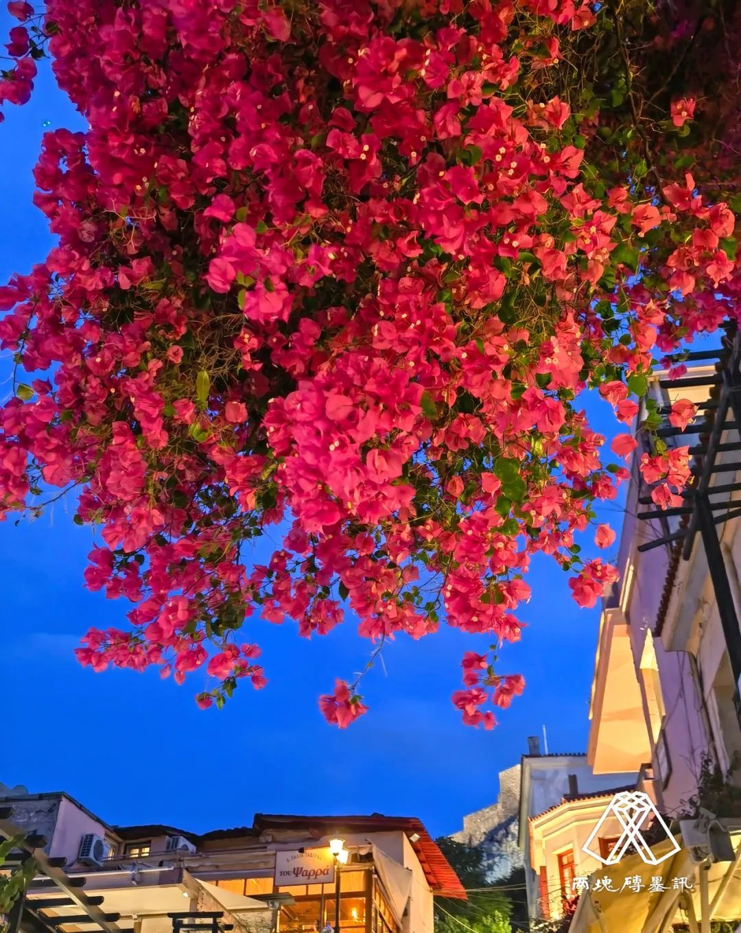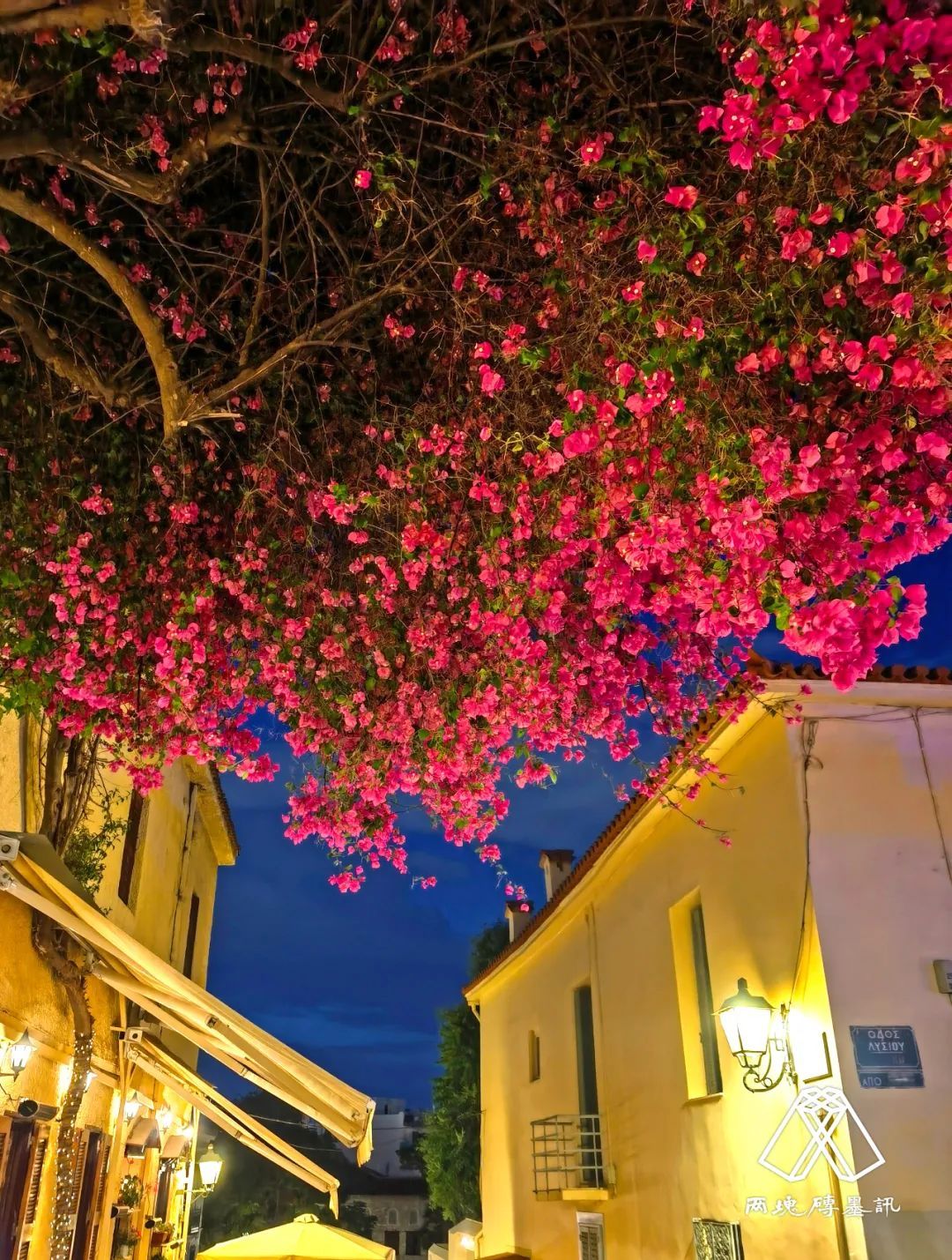 到希腊的第二天晚上,在一家餐馆吃饭。这家餐馆门前有一蓬三角梅,在灯光照耀下格外艳丽,如同熊熊燃烧的烈焰。