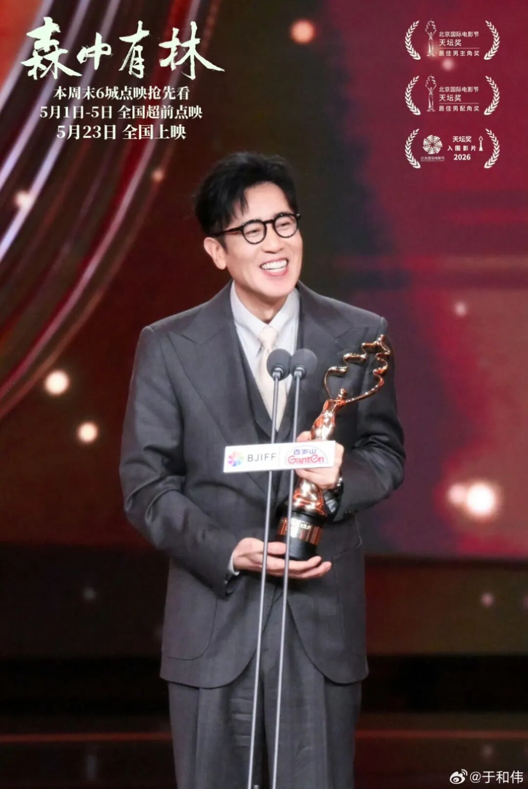 如今,继《悬崖之上》饰演周乙获得第34届中国电影金鸡奖最佳男主角提名之后,于和伟终于凭《森中有林》获得北京国际电影节“天坛奖最佳男主角”殊荣。