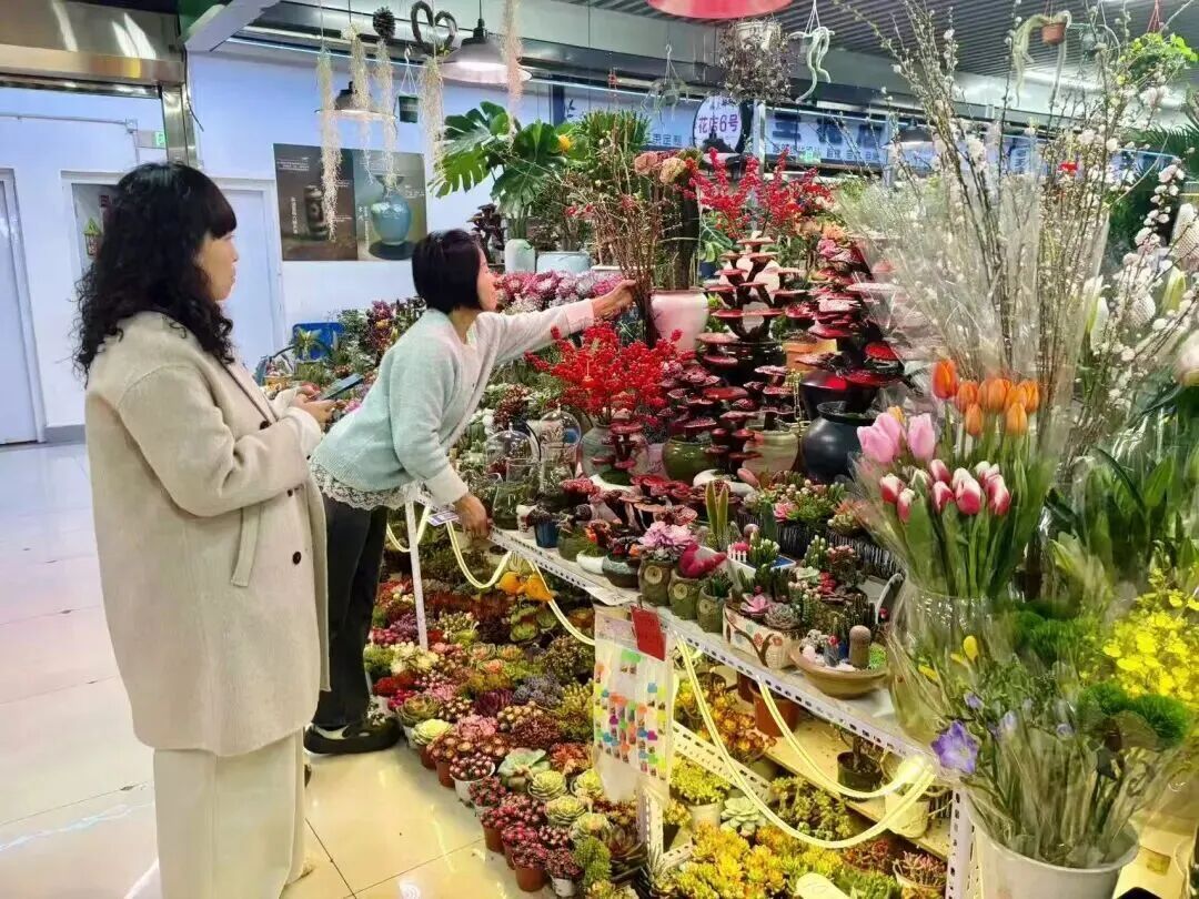 在大运河市场B1层爱宠益家花卉展销区,沁人心脾的花香裹着暖意扑面而来。