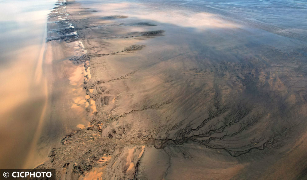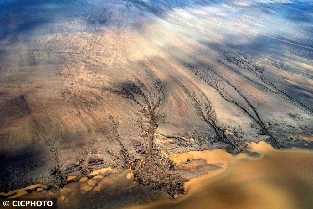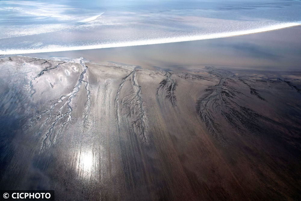 2022年10月14日,浙江省海宁市,钱塘江尖山入海口江中沙洲退潮后出现“潮汐树”自然景观。(无人机拍摄)CICPHOTO/沈达 摄