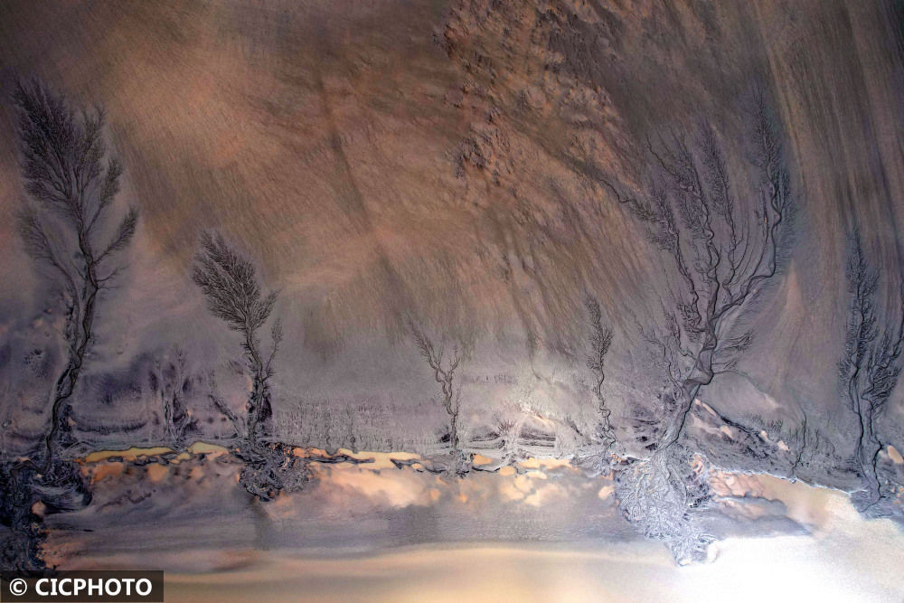 2022年10月14日,浙江省海宁市,钱塘江尖山入海口江中沙洲退潮后出现“潮汐树”自然景观,这是海水受潮汐影响在上涨、回落过程中形成的一种沉积地貌,如同写意的水墨画卷。