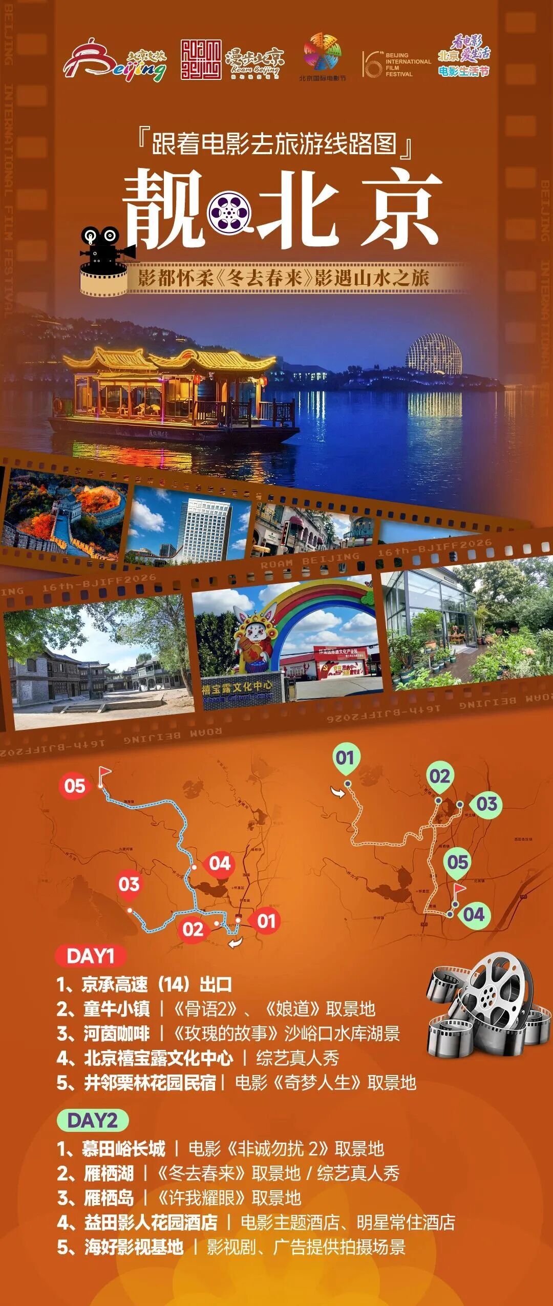 次日登临慕田峪长城,寻觅《非诚勿扰 2》经典镜头,尽览雄关壮美;漫步雁栖湖周边,打卡《冬去春来》影视、综艺等取景地,畅享山水休闲;登雁栖岛,邂逅《许我耀眼》同款高端场景,饱览湖岛风光;益田影人花园酒店品尝美食,沉浸电影主题氛围,体验明星同款旅居;最后走进海好影视基地,近距离感受影视剧、广告拍摄幕后场景。从影视取景地到长城湖山,综艺、影视与休闲相融,成就一段充实惬意的光影之旅。