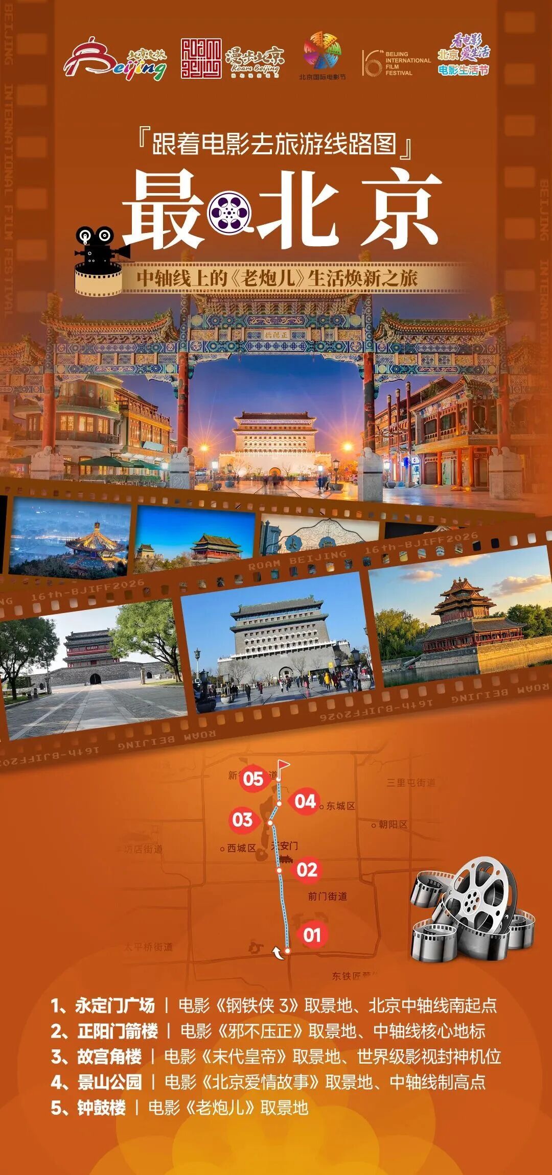 ✨线路解说:沿着北京中轴线漫步,一站式打卡多部中外经典影视取景地,解锁世界遗产与光影交织的独特魅力。从永定门启程,贯穿正阳门、前门大街,感受百年商街的烟火文脉;驻足故宫角楼,定格《末代皇帝》同款封神画面;登顶景山俯瞰全城,尽览中轴全貌;最后抵达钟鼓楼,回味《老炮儿》里的老北京韵味,全程串联古今风华,读懂北京中轴线的厚重与浪漫。