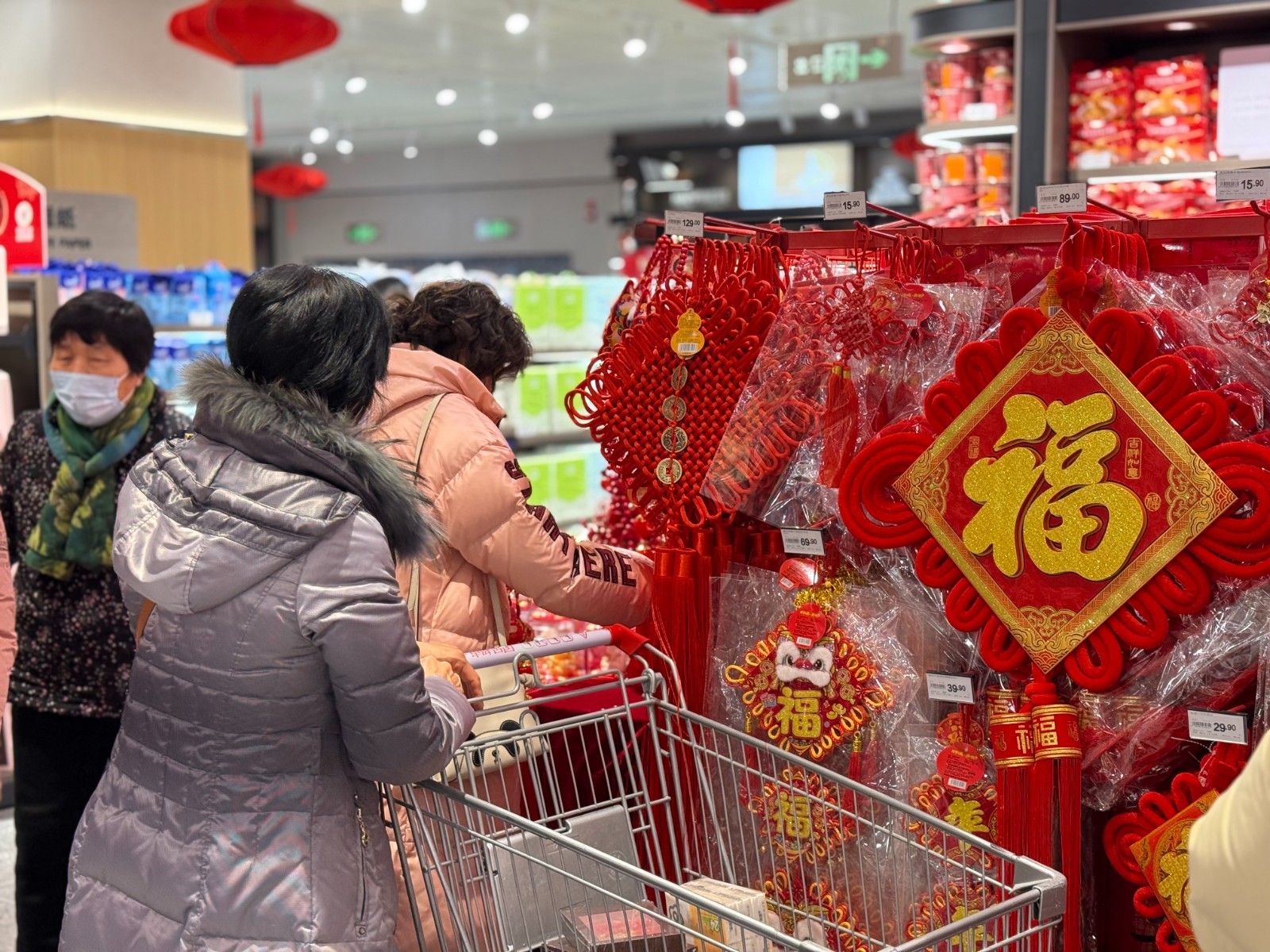临近年关,门店设置了年货专区,红火的春节吊幔、喜庆的灯笼与福字、琳琅满目的年货礼盒……浓厚的年节氛围扑面而来。