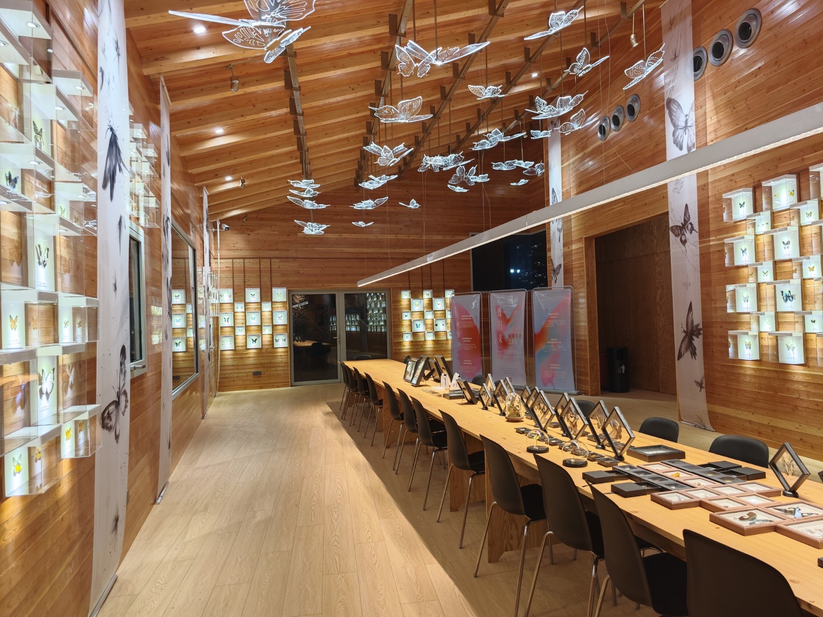 在这条研学线路上,蝴蝶生态艺术馆是最新落成的亮点。蝴蝶馆不仅是一座展示蝴蝶生态与生物多样性的艺术空间,更是一个激发创造、连接自然的研学平台,馆内推出一系列以蝴蝶为主题、寓教于乐的研学课程,涵盖观察探索、手工创作、数字互动等多种形式。步入展馆,一面汇集150余种蝴蝶的标本墙赫然呈现,由北京林业大学团队参与设计的灯光艺术模型,以数只灵动的蝴蝶光影勾勒出蝶群翩跹的盛大场面。艺术馆依托“企业+高校+专业机构+村民创客”多方协作模式,兼具专业性、趣味性与美学价值。