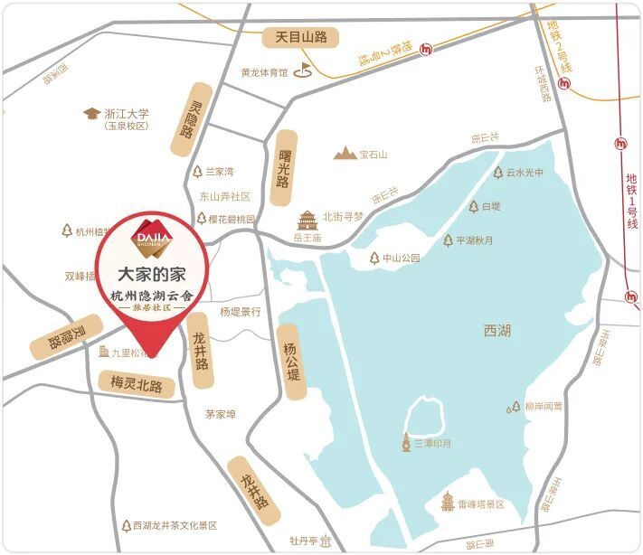 “在山水之间”,到底是多远呢?这张地图一目了然。坐落在西湖景区内的隐湖云舍,紧邻著名景点“杭州花圃”,距离“西湖十景”之一的“曲院风荷”1.6公里,距离大名鼎鼎的灵隐寺1.7公里。
