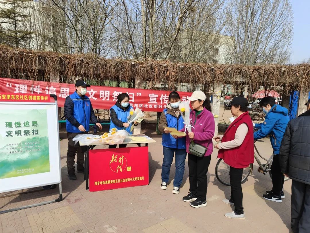 清明将至,思亲更浓,为树立文明新风、倡导以文明环保方式祭祀故人,营造更安全、更整洁的社区环境,4月3日上午,新安里东区社区新时代文明实践站开展“理性追思 文明祭扫”宣传活动。社区工作人员向居民们发放了菊花和文明祭扫倡议书,倡导社区居民从自身做起、从点滴做起,讲文明、树新风,理性追思,文明缅怀。