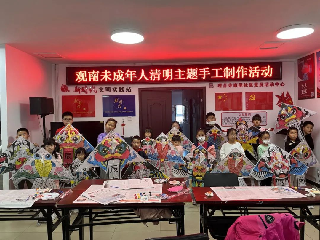 观音寺南里社区新时代文明实践站以独特的清明节亲子手工制作活动,号召大家以文明健康的方式度过一个绿色清明。孩子和家长们共同制作了纸鸢,寓意着绿水青山,人与自然和谐共处,才是前人留给我们的,也是我们可以留给后代最珍贵的礼物。