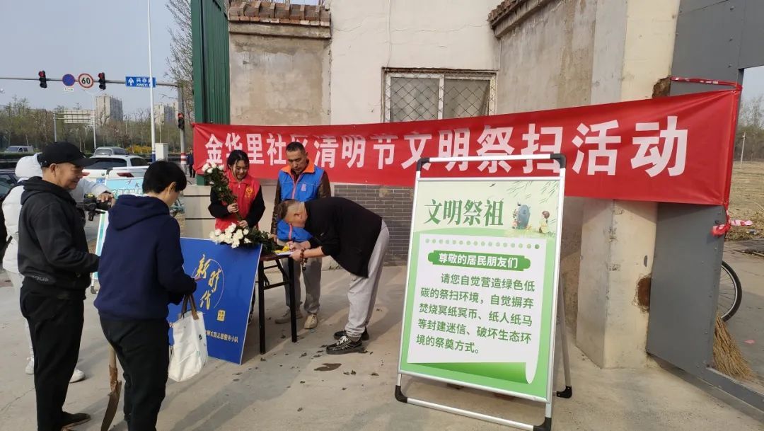 活动当天,社区居委会和志愿者们通过悬挂宣传条幅,现场宣讲及冥纸换菊花等形式,重点向群众宣传健康祭扫、安全祭扫、文明祭扫的理念,引导群众树立“清明上坟莫烧纸,一束菊花寄哀思”的绿色文明祭扫新风尚。
